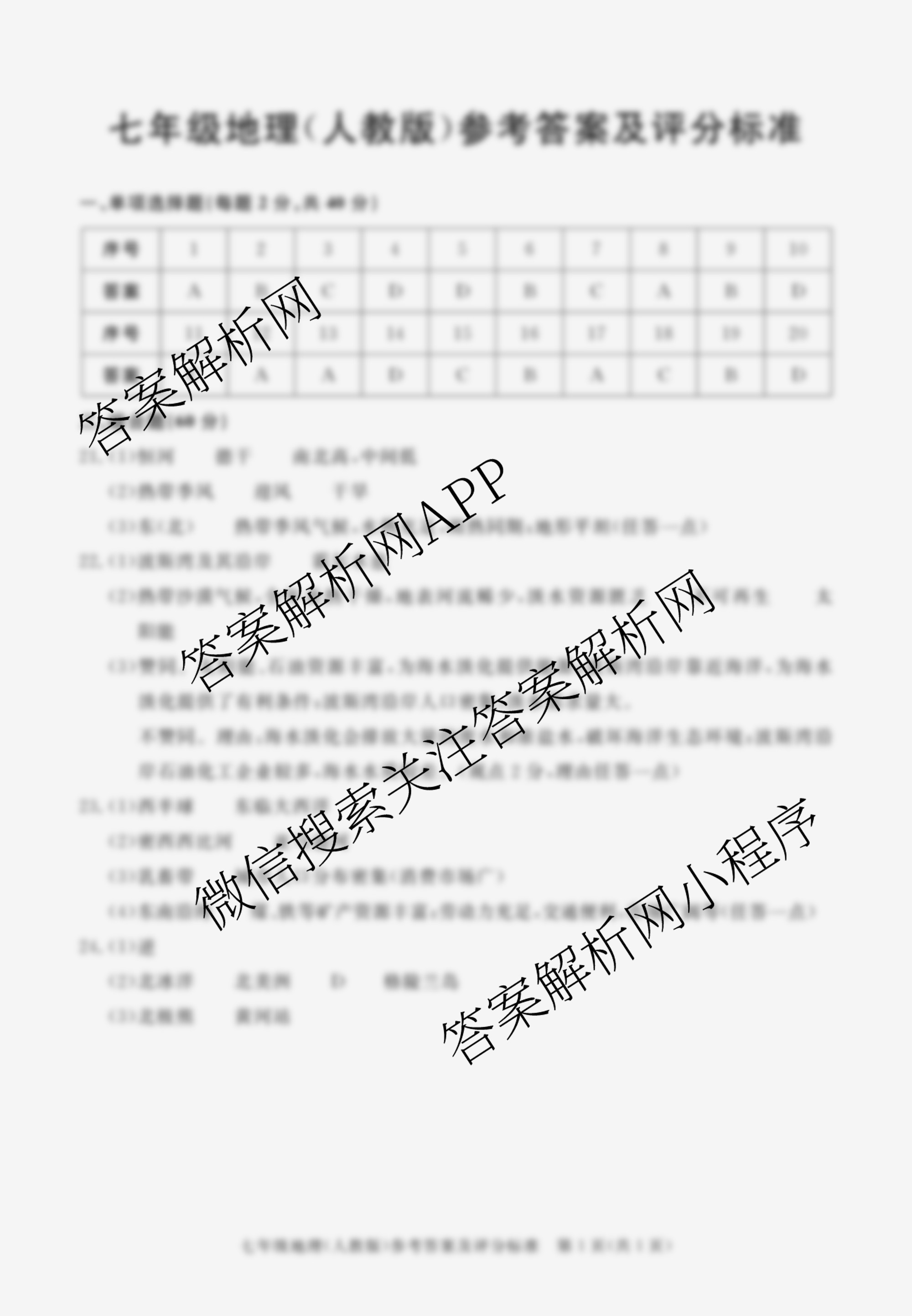 - 2023-2024七年级安徽省学年下学期期末教学质量调研地理(人教版)答案