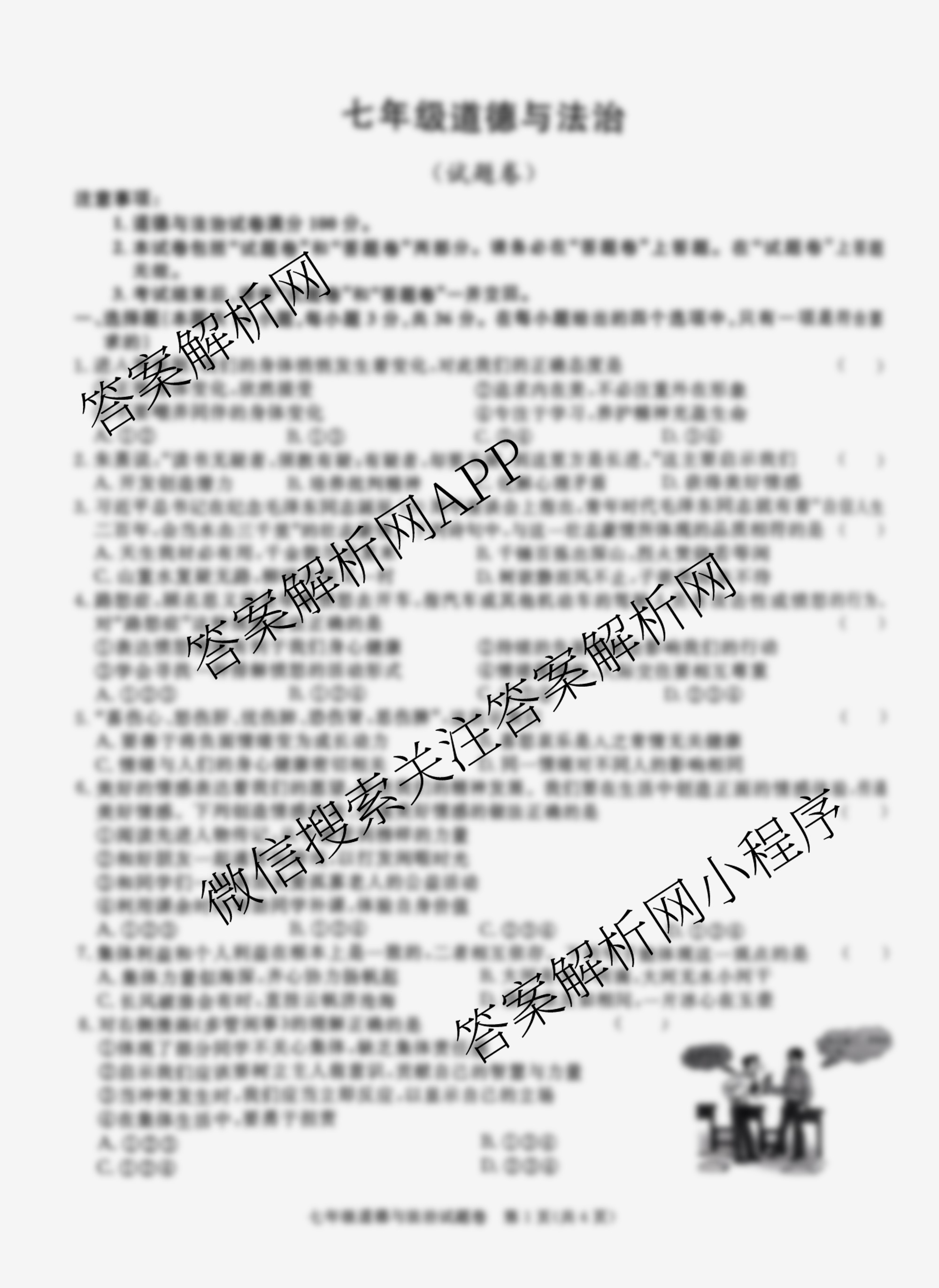 - 七年级安徽省2023~2024学年下学期期末教学质量调研道德与法治答案