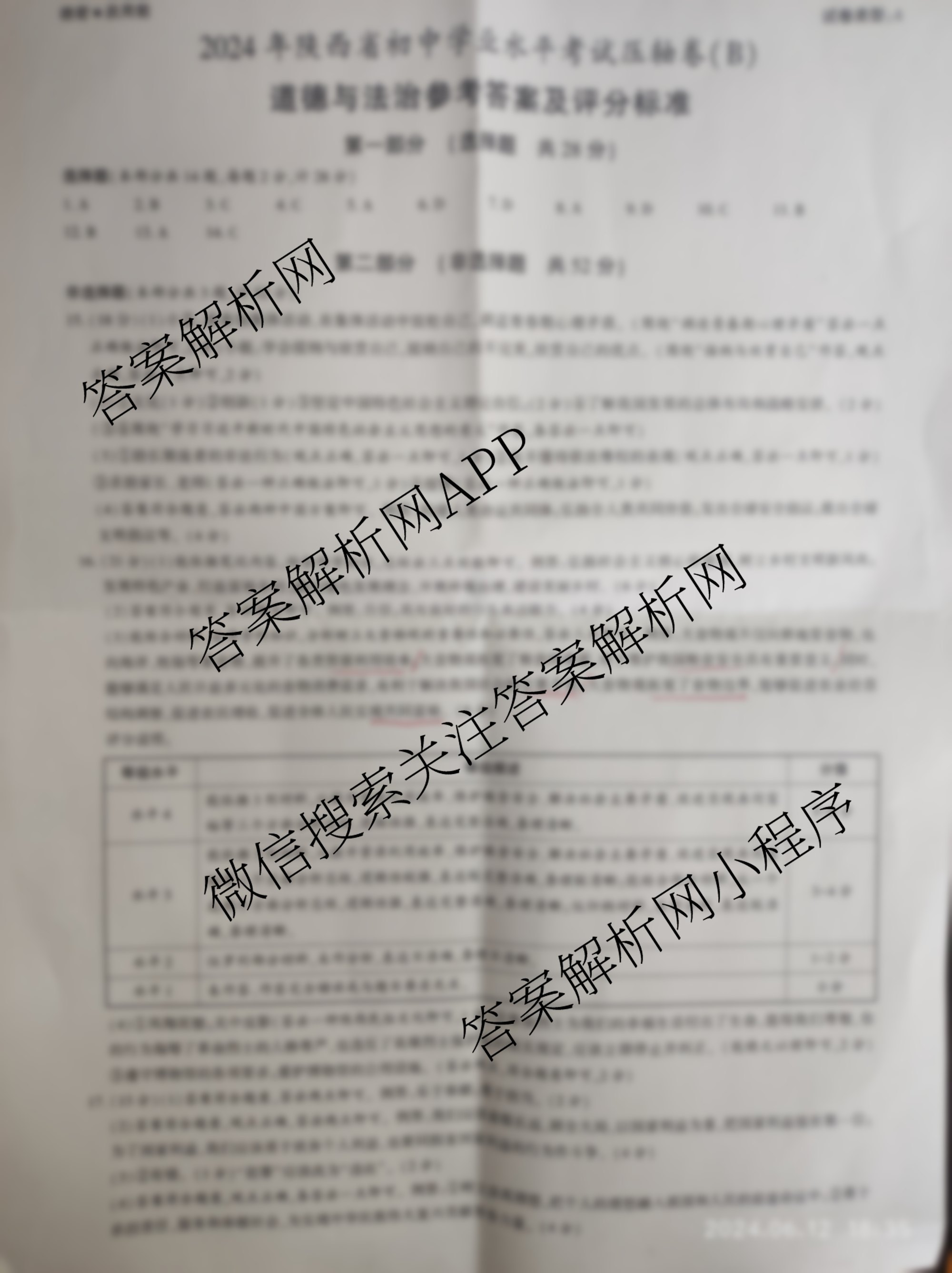 [益卷]·2024年陕西省初中学业水平考试压轴卷道德与法治(B)答案