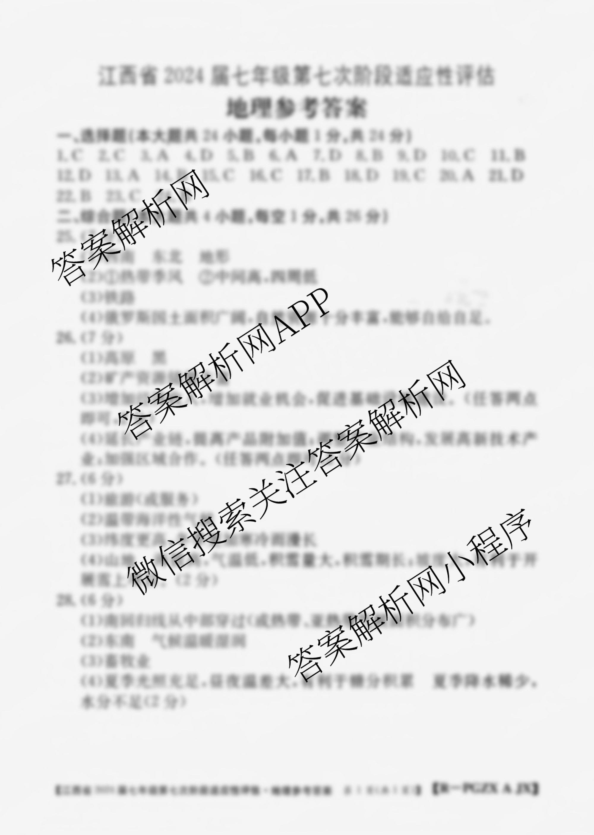 - 2024届江西省(七年级)第七次阶段适应性评估[PGZX A JX]地理(R)答案