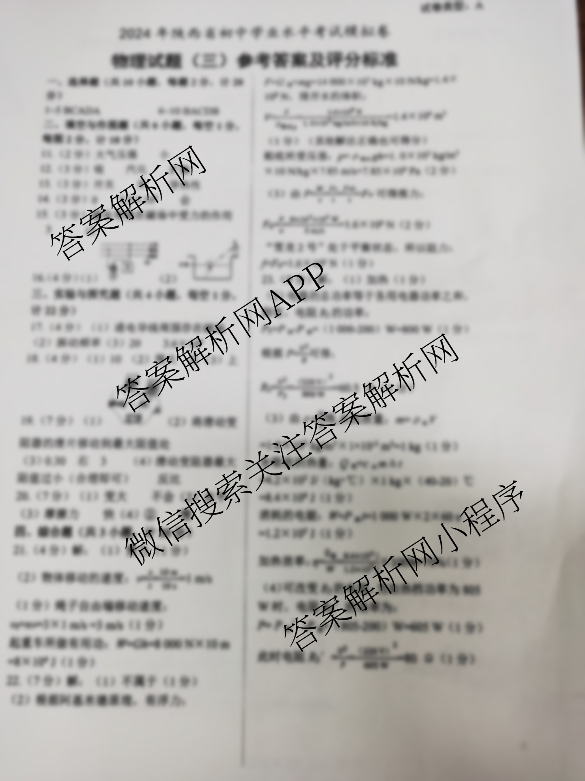 - (益卷)·2024年陕西省初中学业水平考试模拟卷A(三)物理答案
