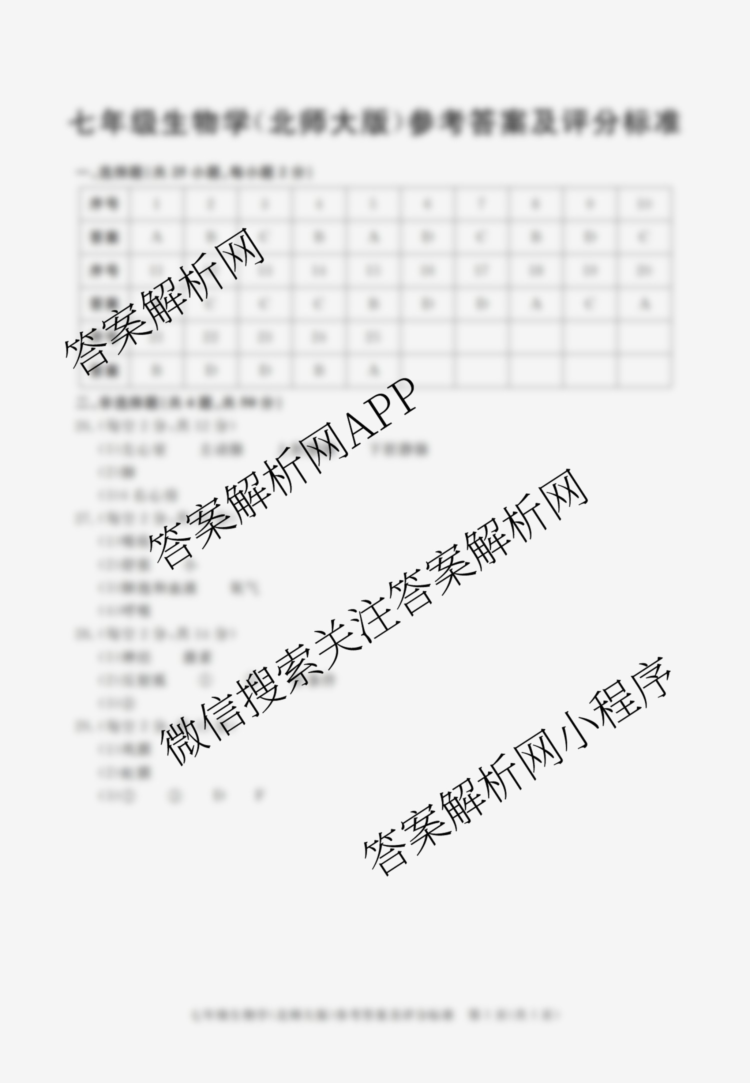 - [七年级]安徽省2023-2024学年下学期教学质量调研三生物(北师大版)答案