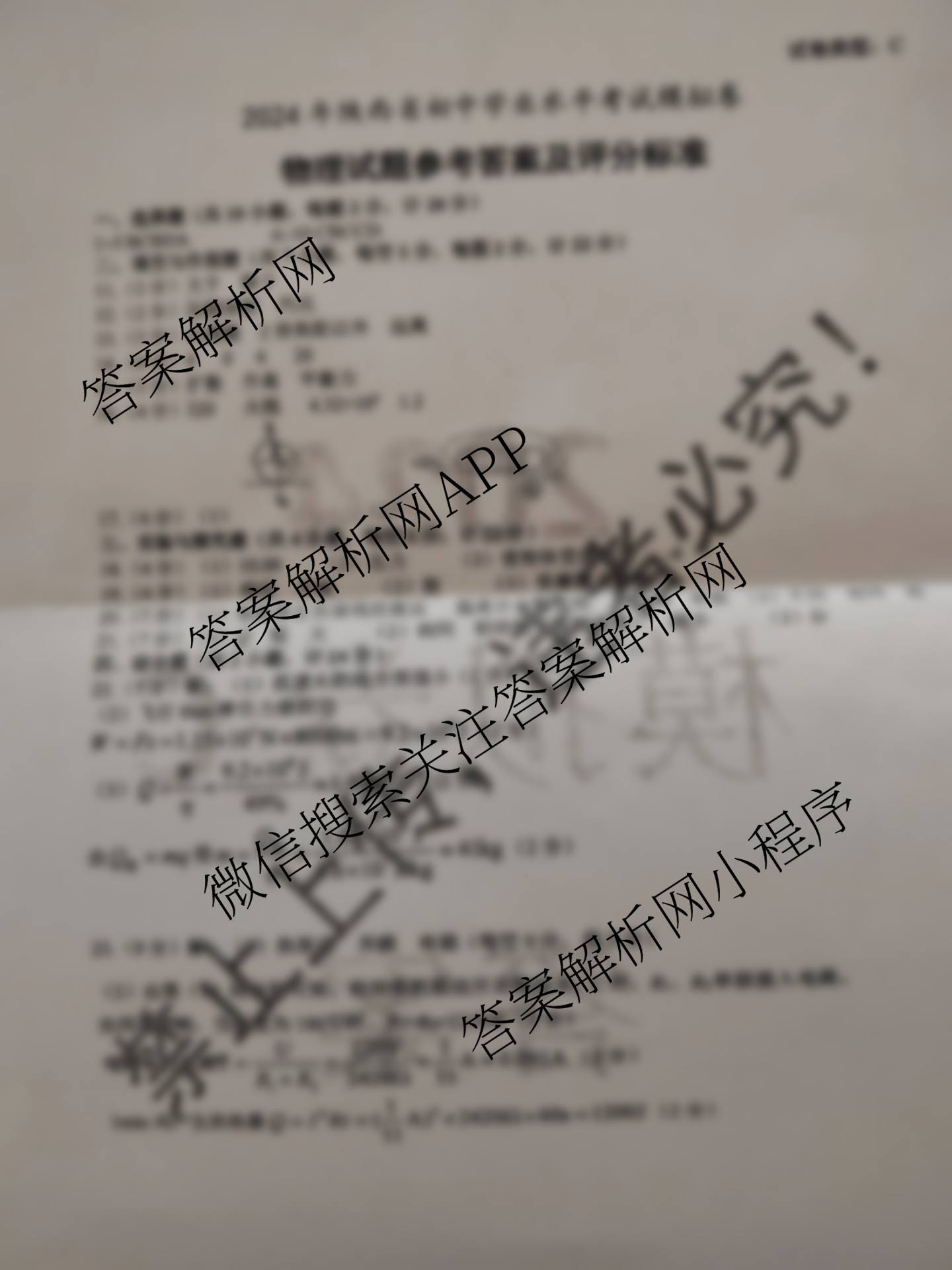 2024年陕西省初中学业水平考试模拟卷C物理答案