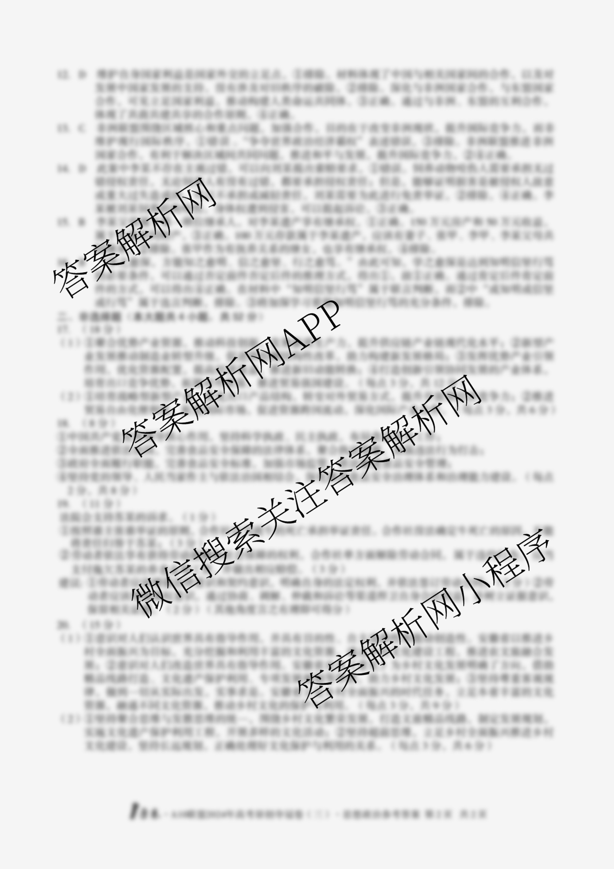 1号卷A10联盟2024年高考原创夺冠卷(三)3政治答案