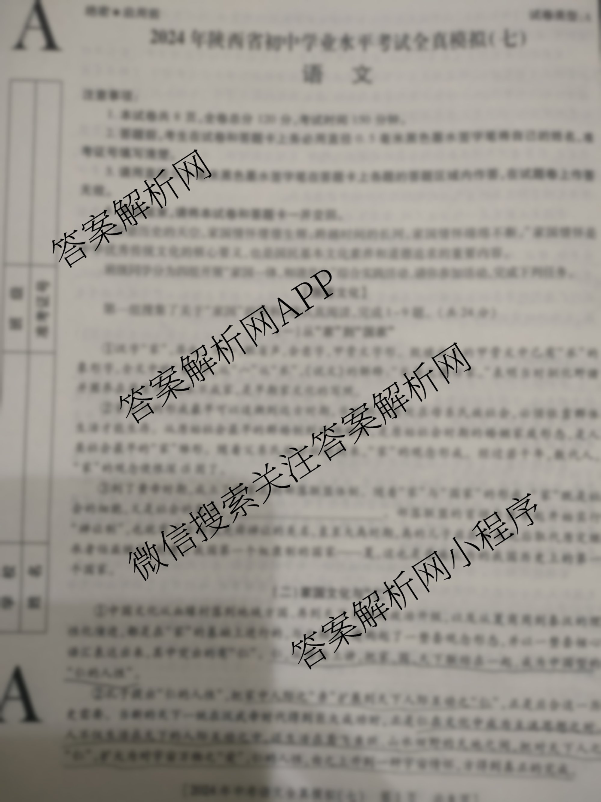 - [九年级]陕西[益卷]2024年陕西省初中学业水平考试全真模拟(七)7语文(A)答案