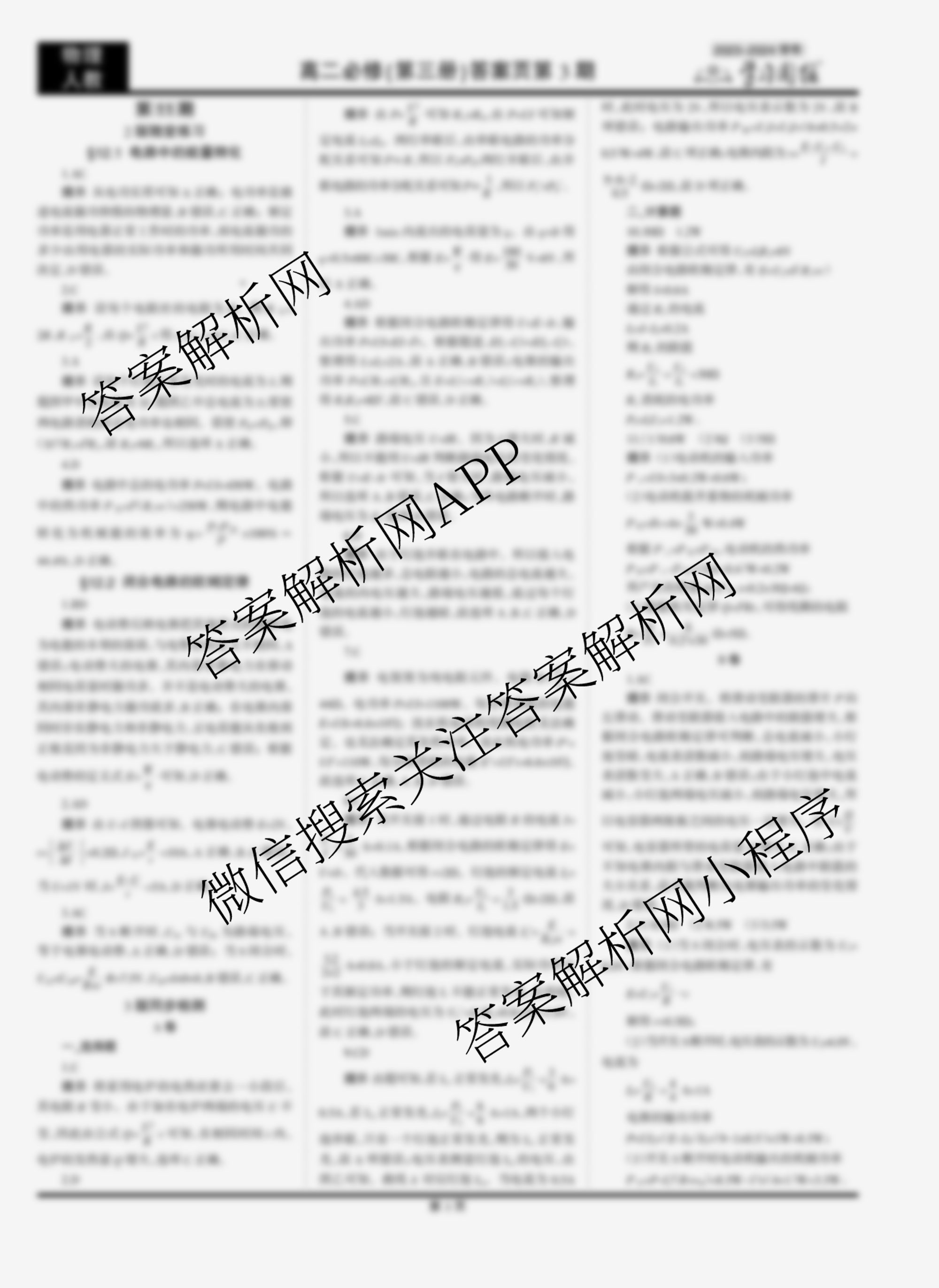 2023-2024 学习周报 物理人教高二必修(第三册)第11期答案