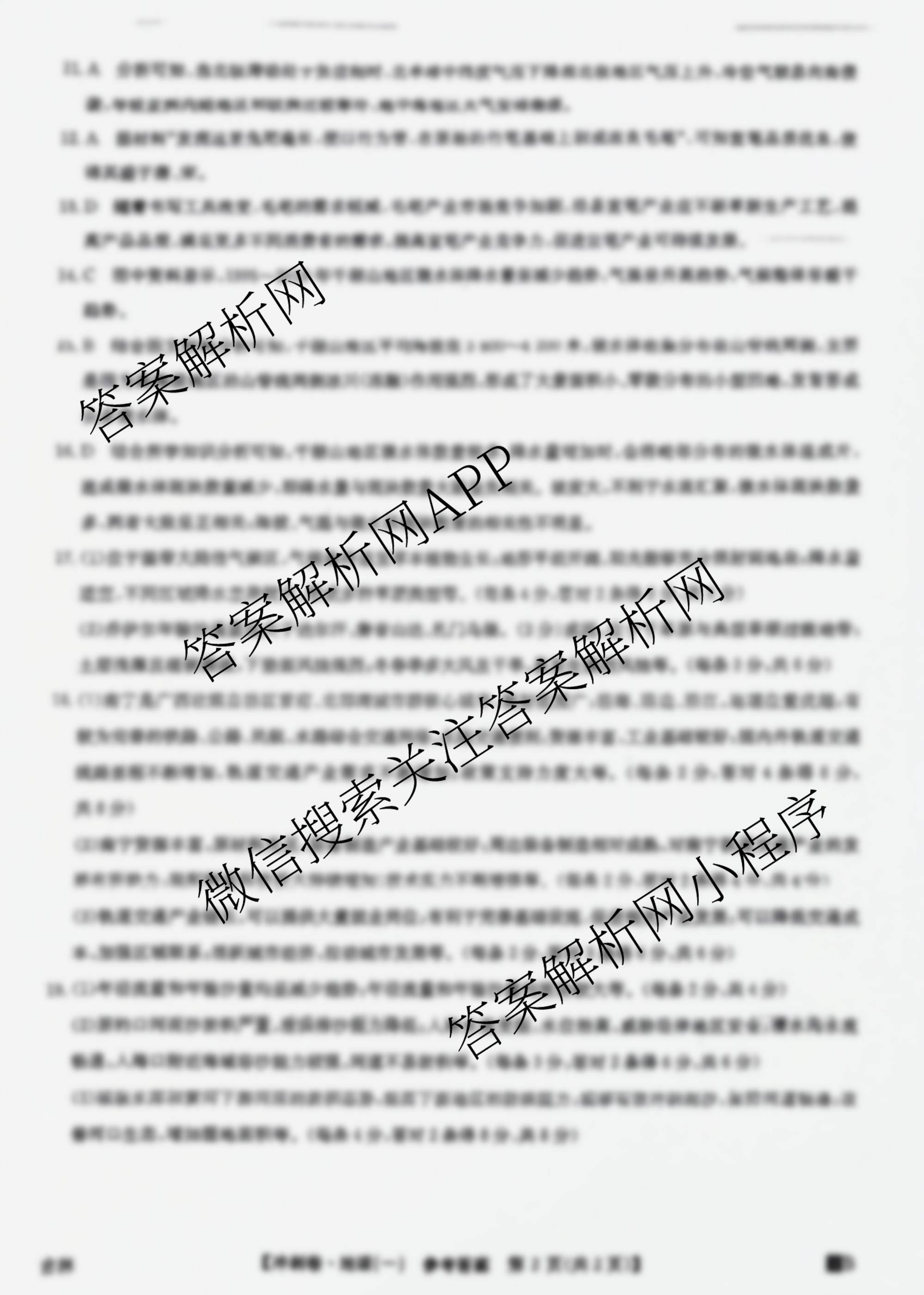 - 2024年安徽省普通高中学业水平选择性考试冲刺压轴卷(一)地理(安徽)答案