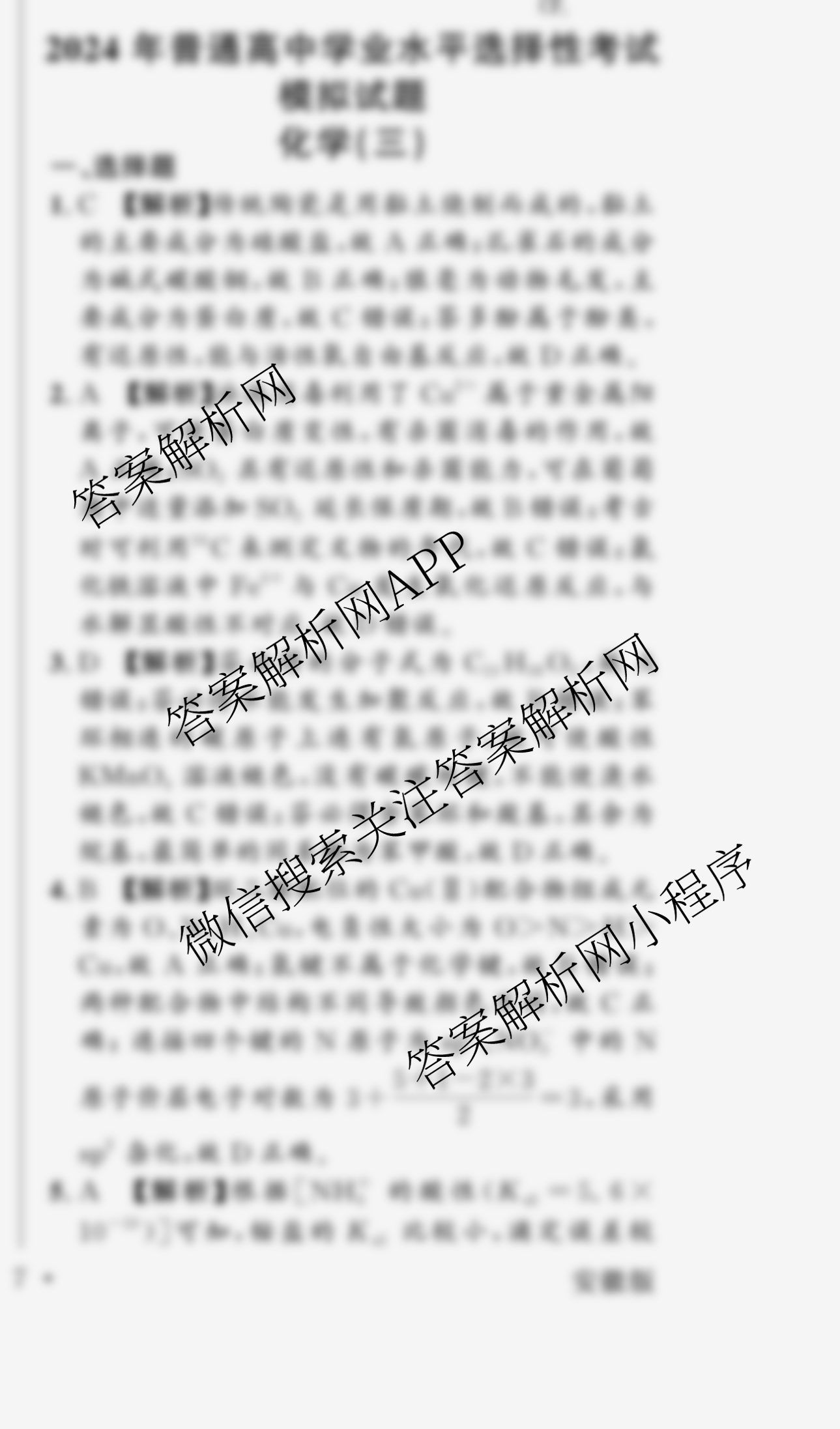 真题密卷考前冲顶实战演练 2024年普通高中学业水平选择性考试模拟试题(三)3化学(安徽版)答案