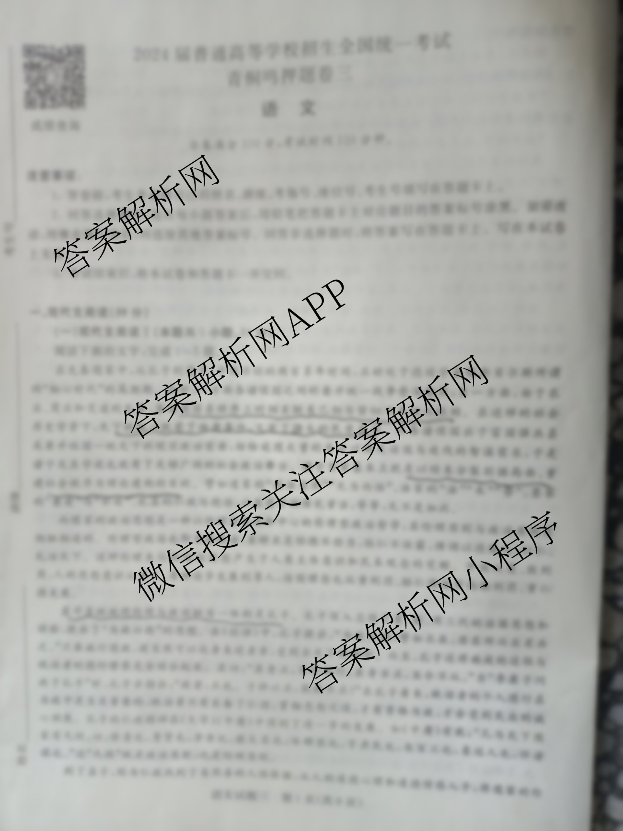 - [高三]青桐鸣·2024年普通高等学校招生全国统一考试 青桐鸣押题卷三 语文(新教材)试题