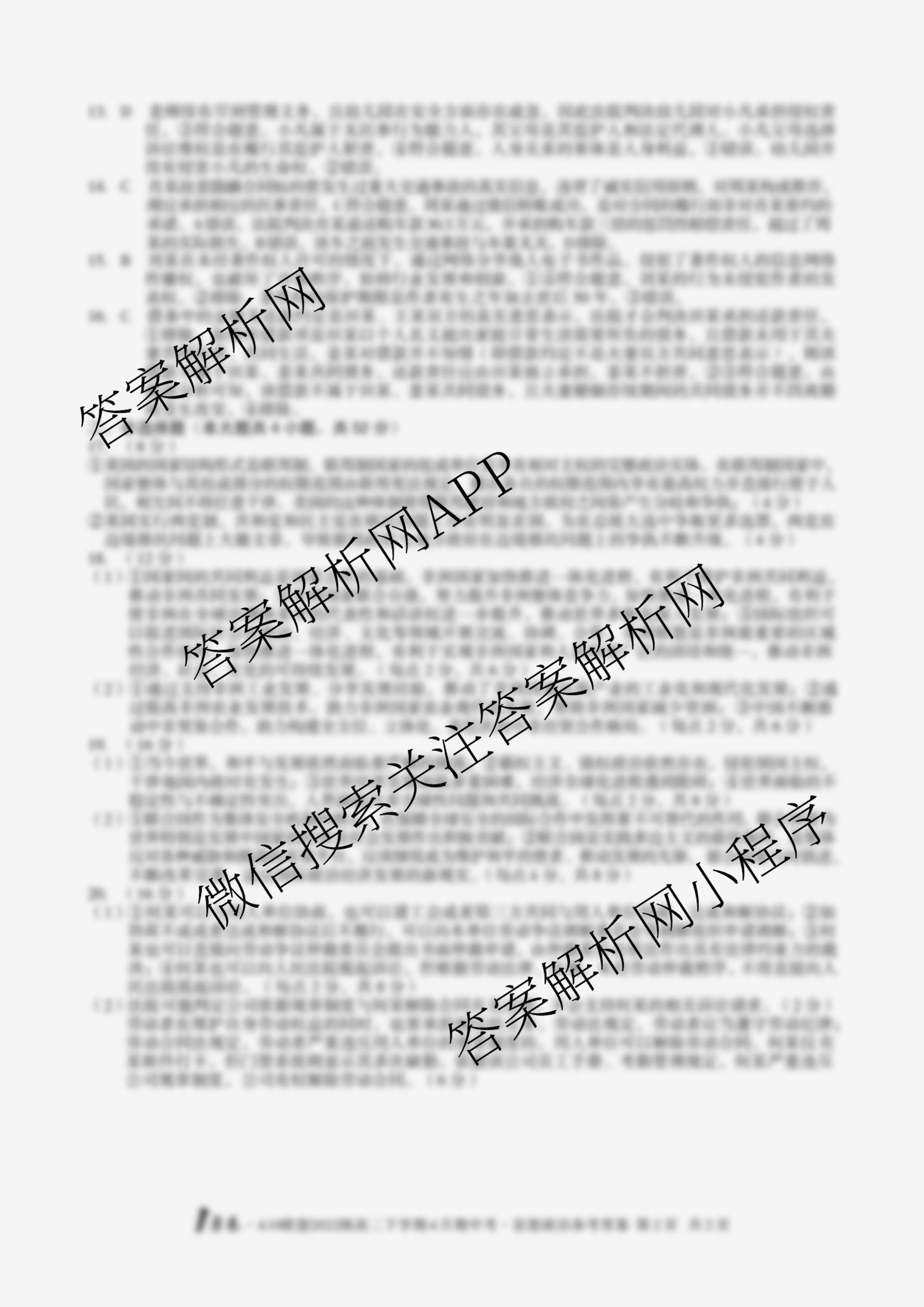 - (1号卷)·A10联盟2022级(高二)下学期4月期中考政治答案