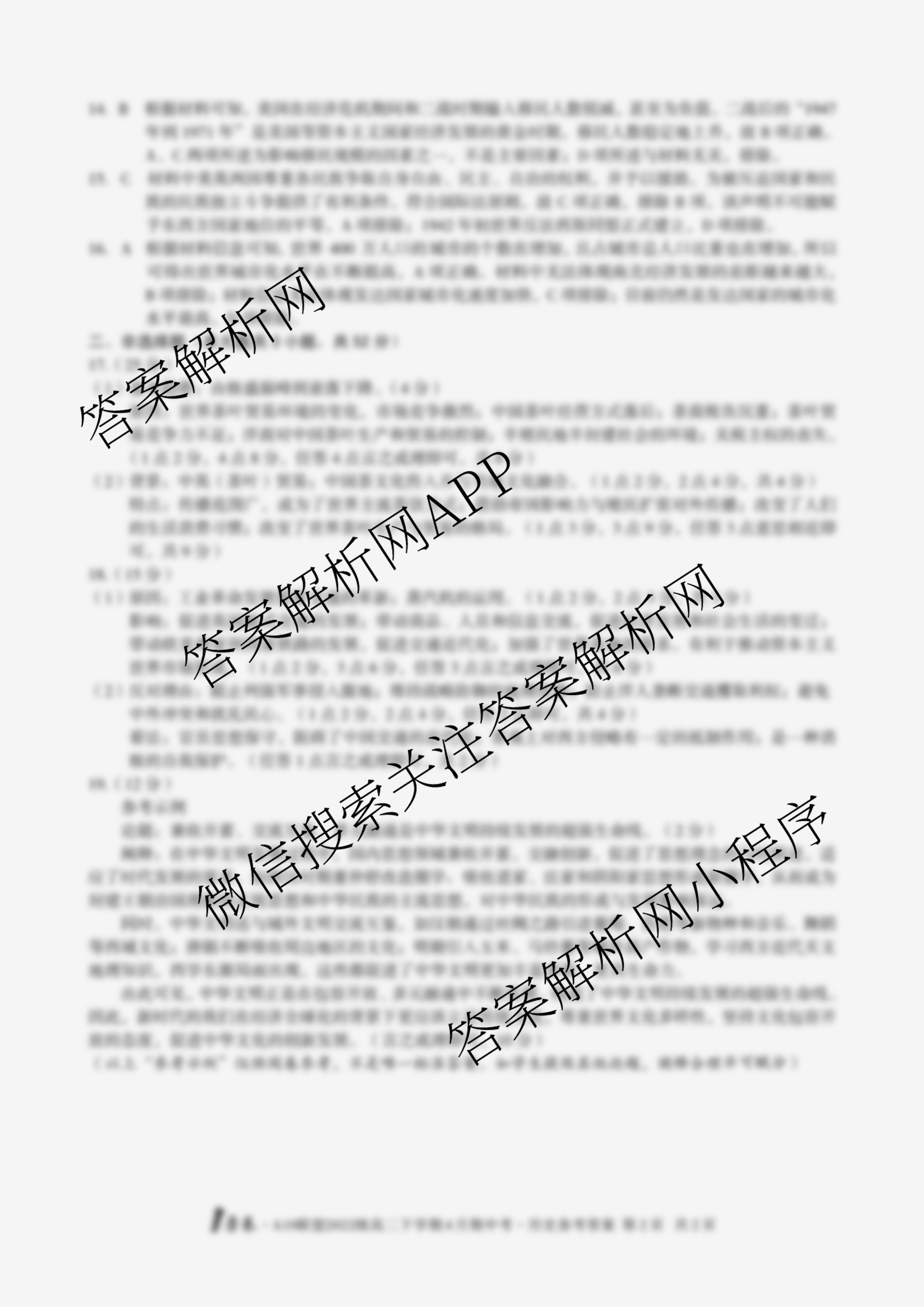 - [高二][1号卷]A10联盟2022级下学期4月期中考历史答案