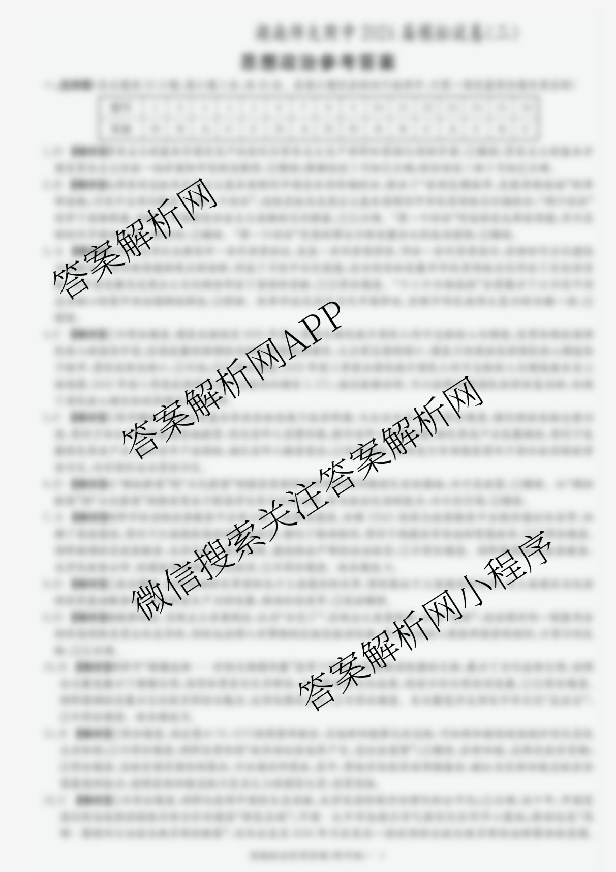 - 2024届(高三)(炎德英才大联考)湖南师大附中模拟试卷(二)政治答案