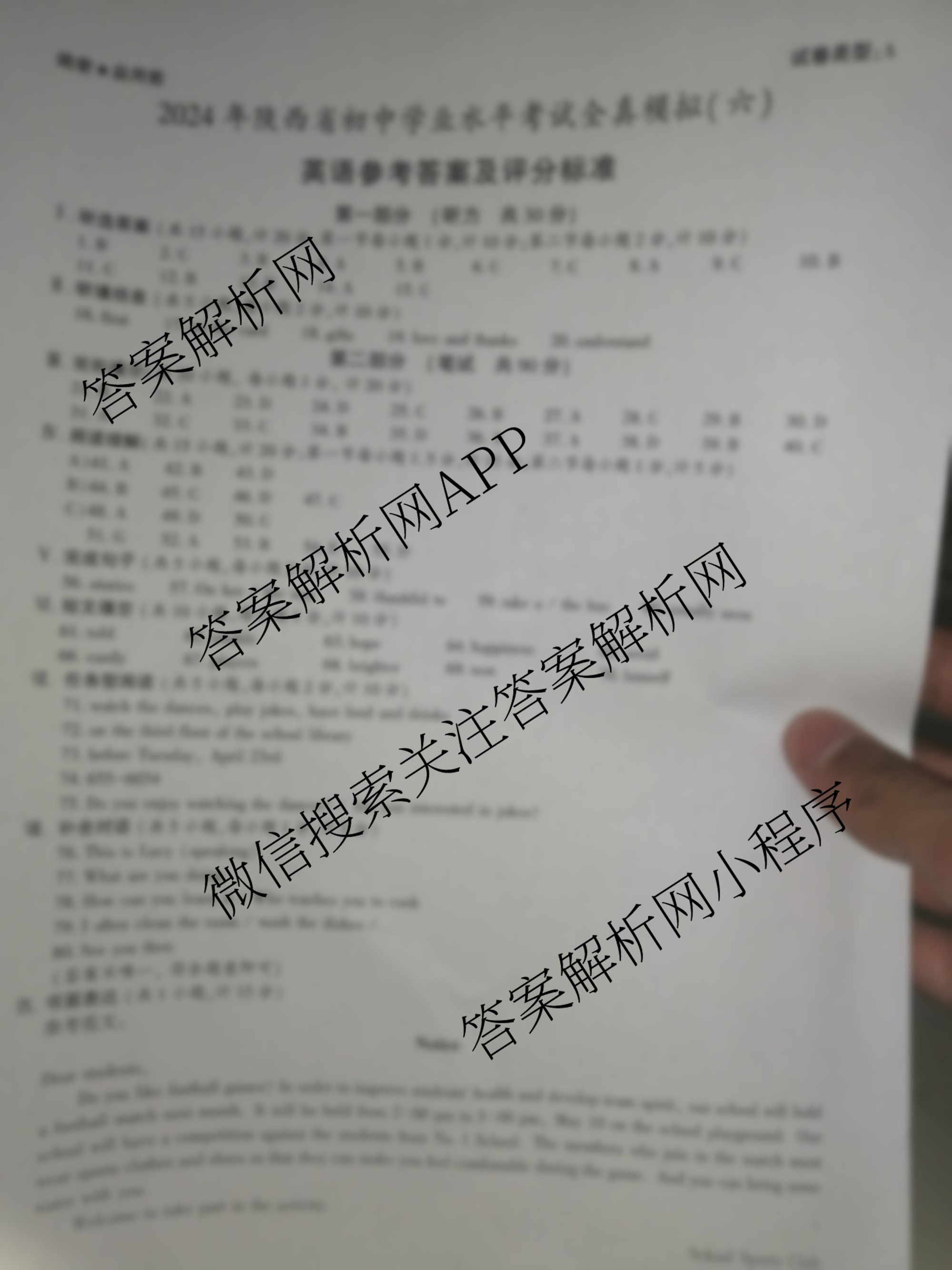 陕西益卷2024年陕西省初中学业水平考试全真模拟(六)6英语(A)答案
