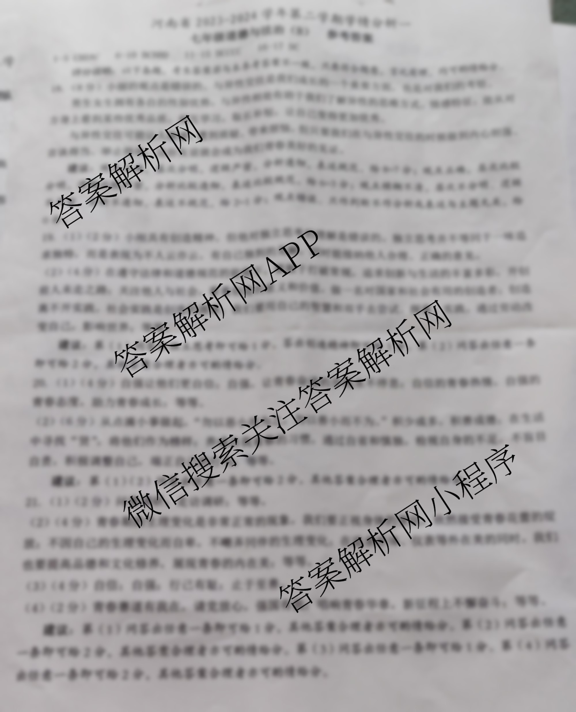 2023-2024[七年级]河南省学年第二学期学情分析一道德与法治(B 统编版)答案