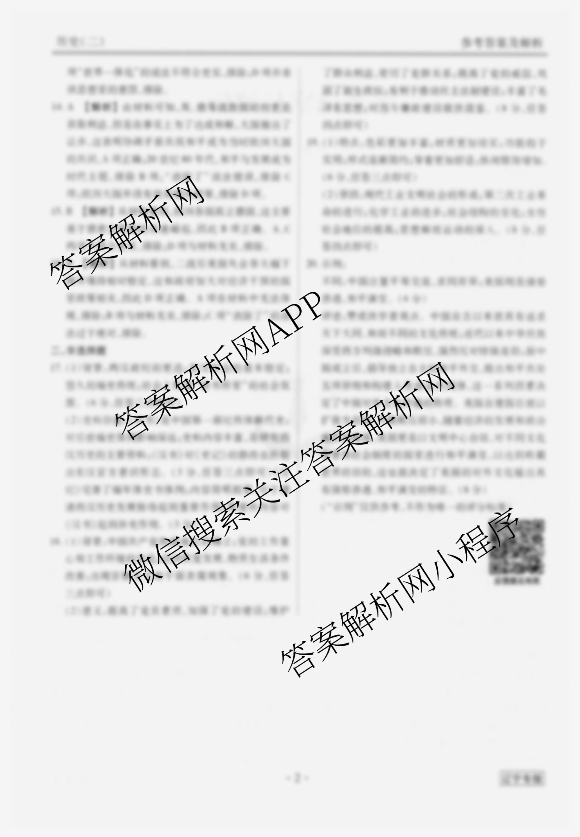 - [衡水金卷先享题]调研卷 2024年普通高中学业水平选择性考试模拟试题(二)2历史(辽宁专版)答案