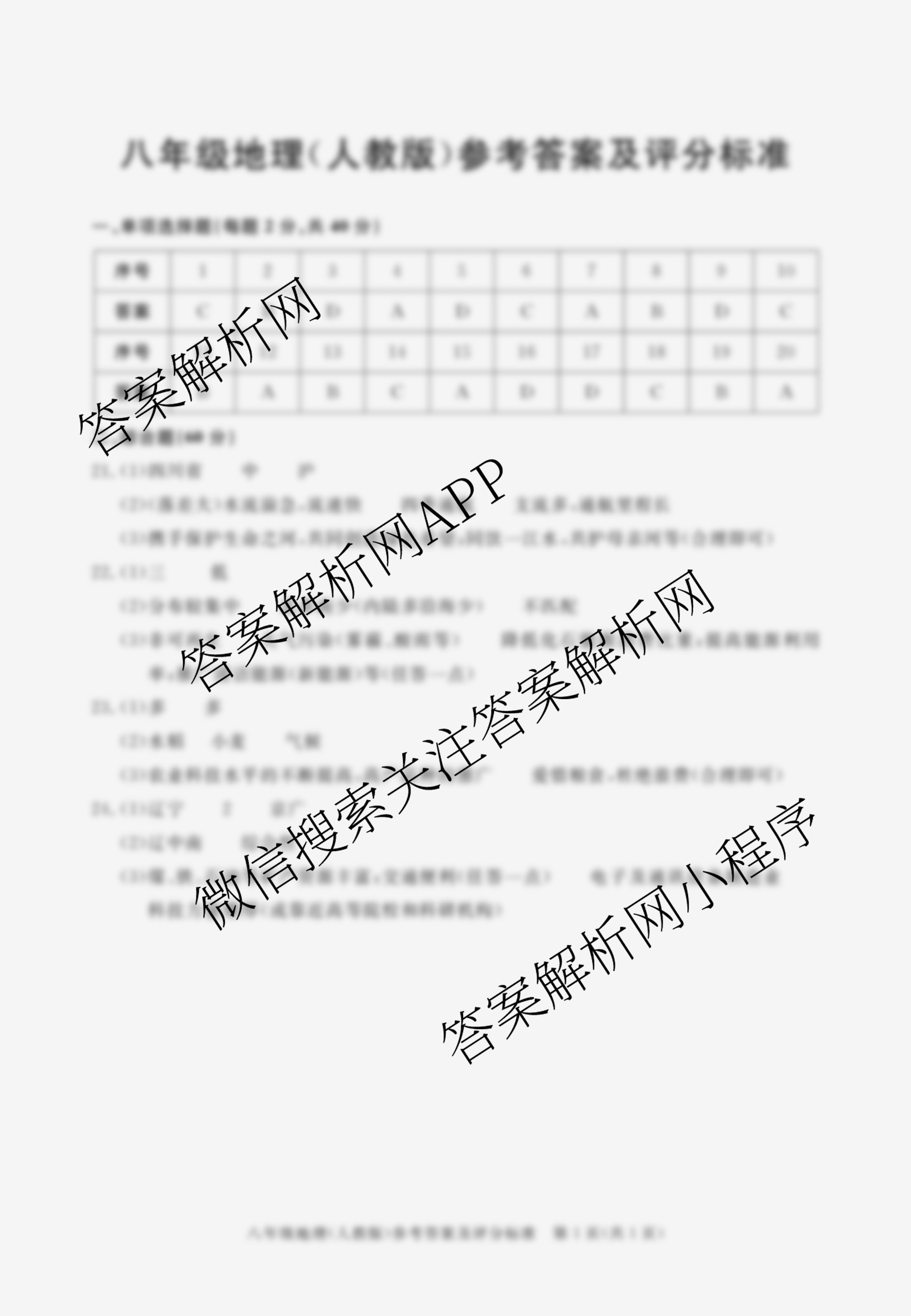 - 2023~2024[八年级]安徽省学年上学期期末教学质量调研 地理(人教版)答案
