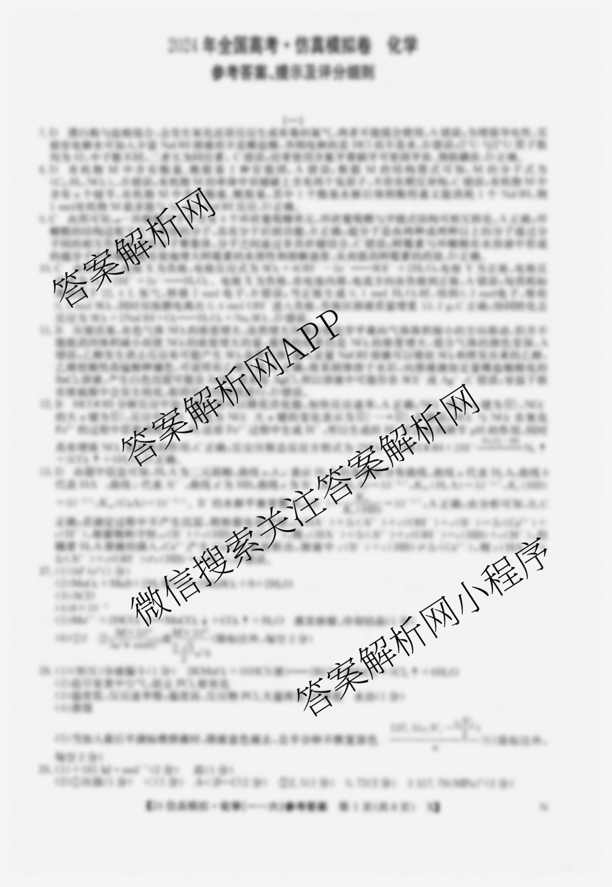 - [高三]2024年普通高校招生选考科目考试仿真模拟卷(一)1化学(C N)答案