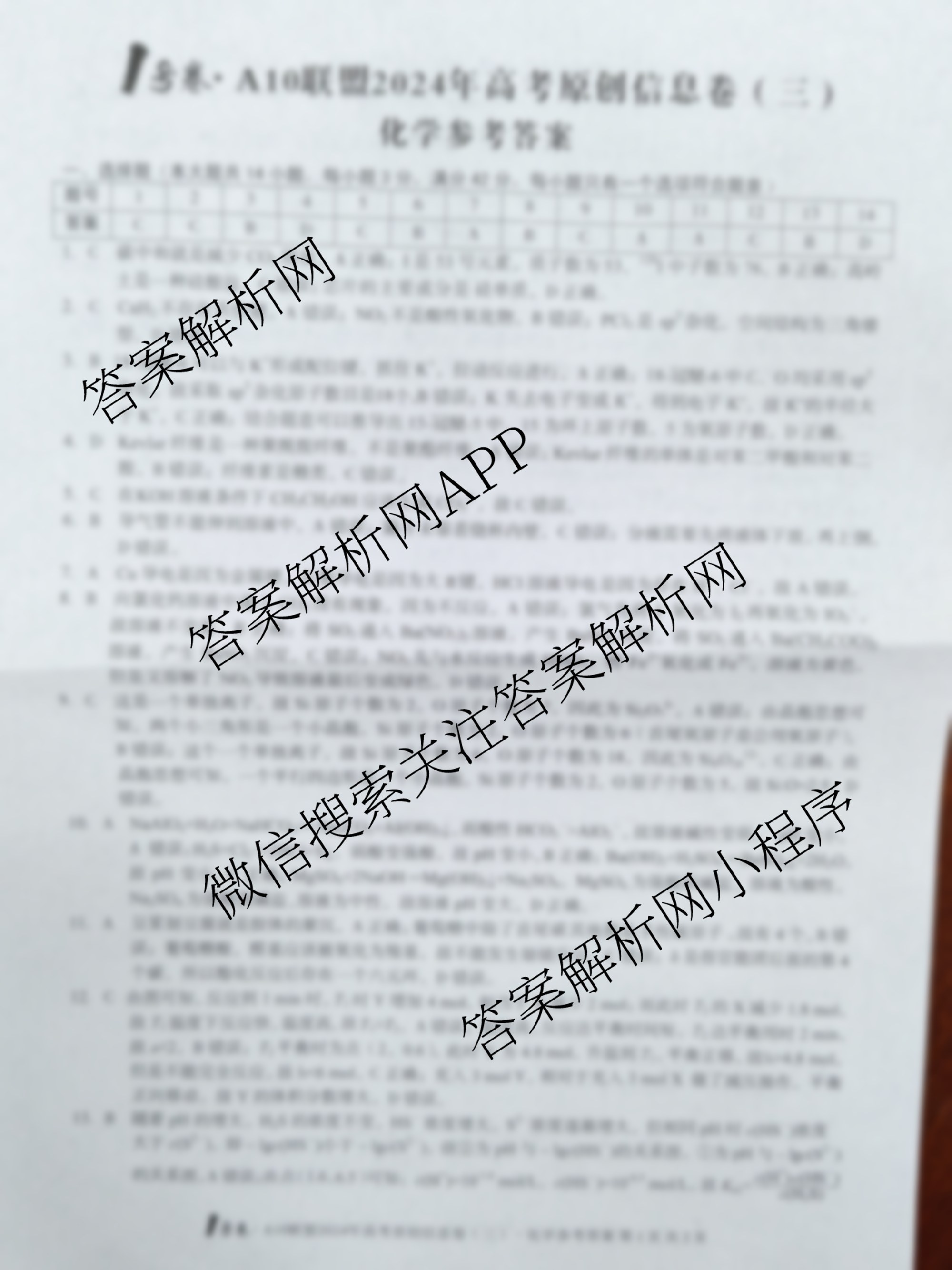 高三[1号卷]A10联盟2024年高考原创信息卷(三)3化学答案