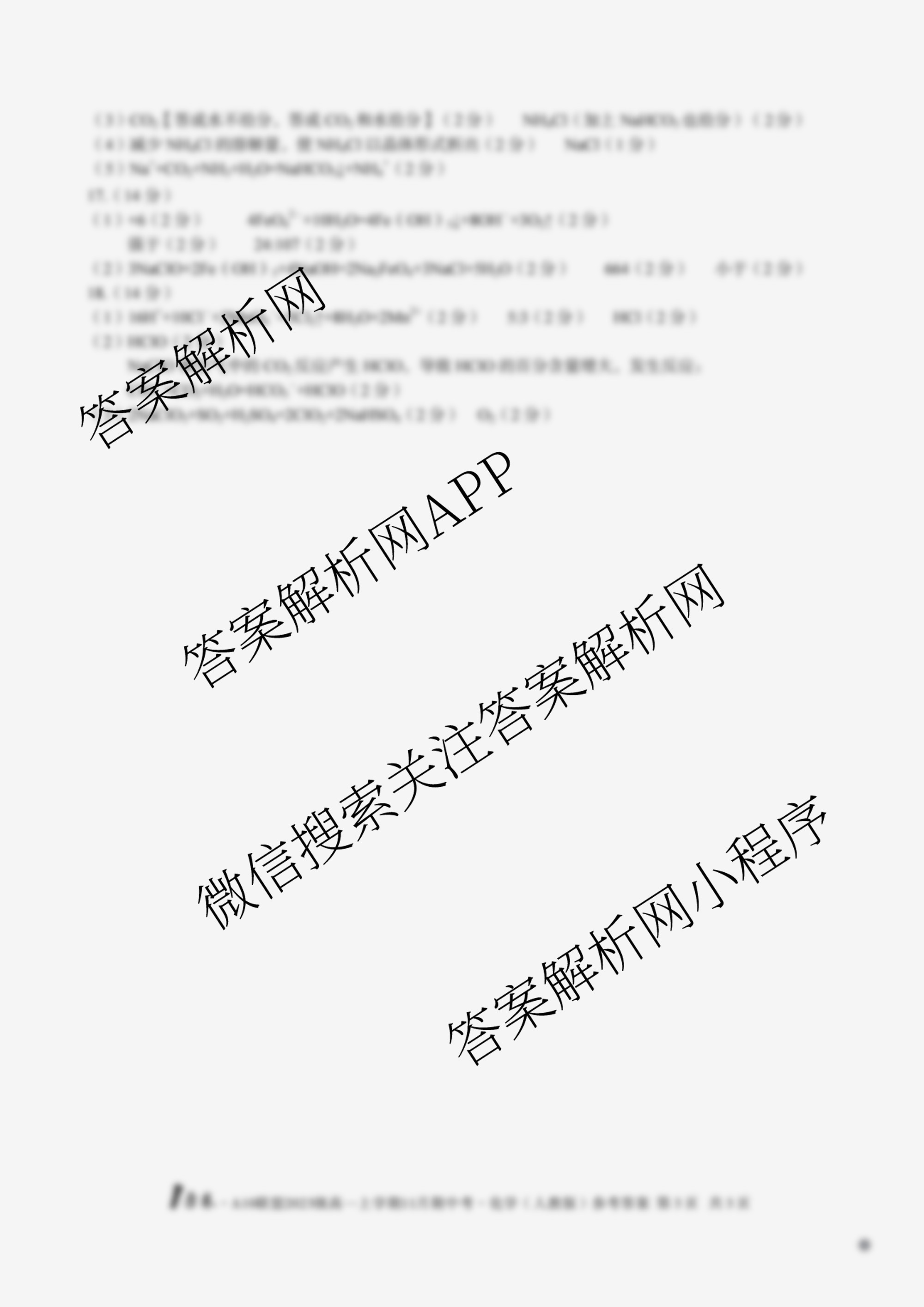 - (1号卷)·A10联盟2023级(高一)上学期11月期中考化学(人教版B)答案