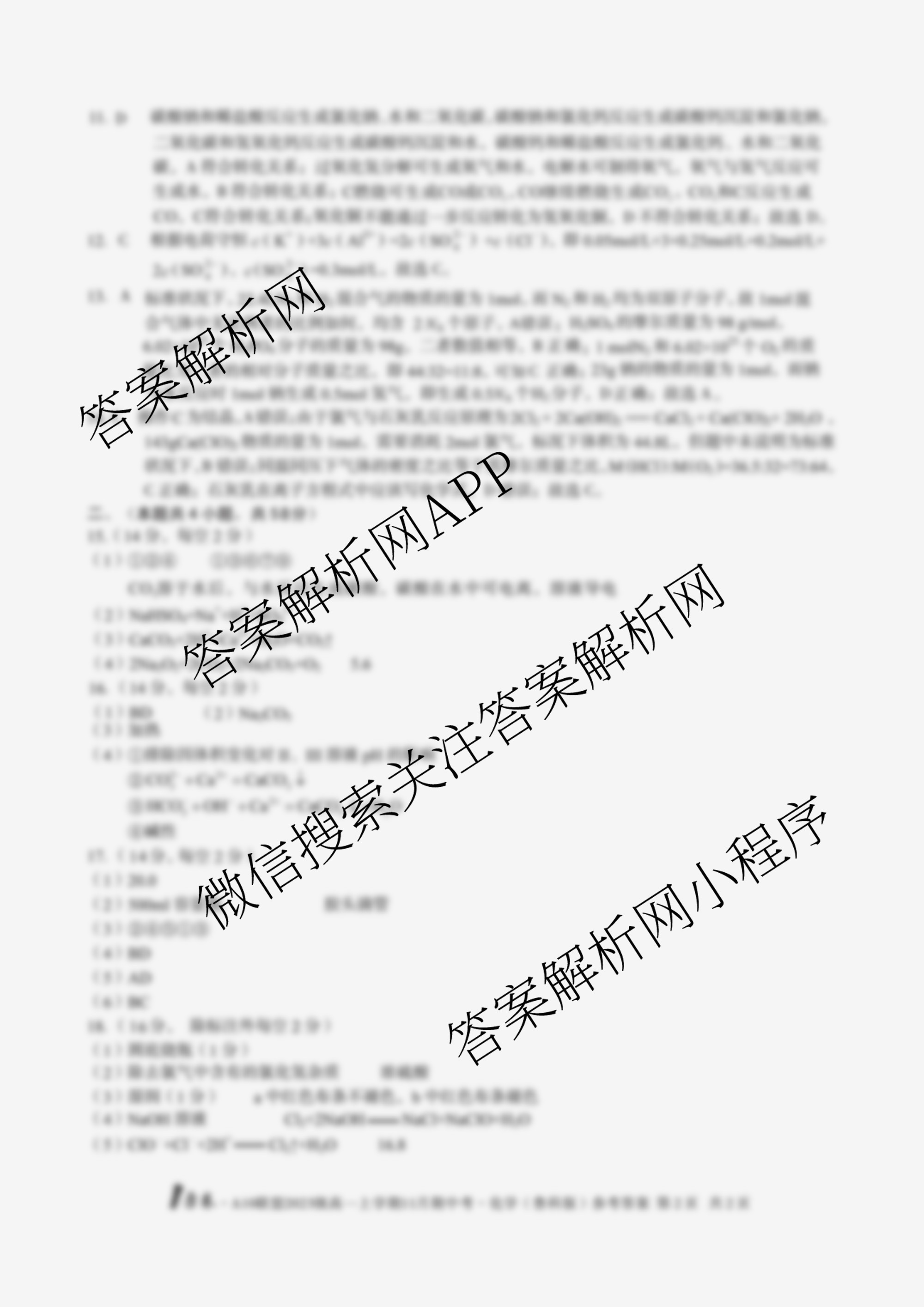 - (1号卷)·A10联盟2023级高一上学期11月期中考化学(人教版)答案