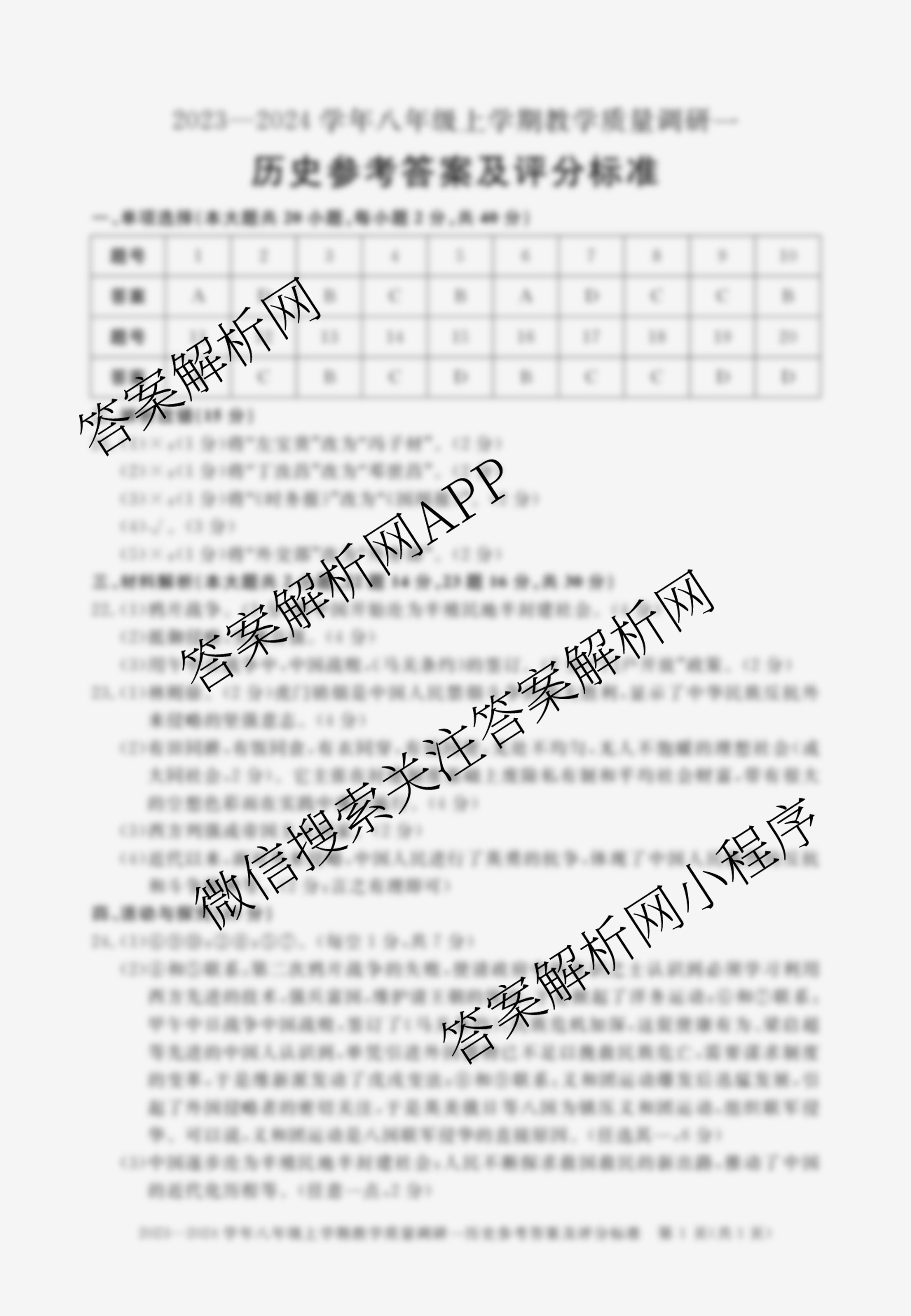- (八年级)安徽省2023~2024学年上学期教学质量调研一历史答案