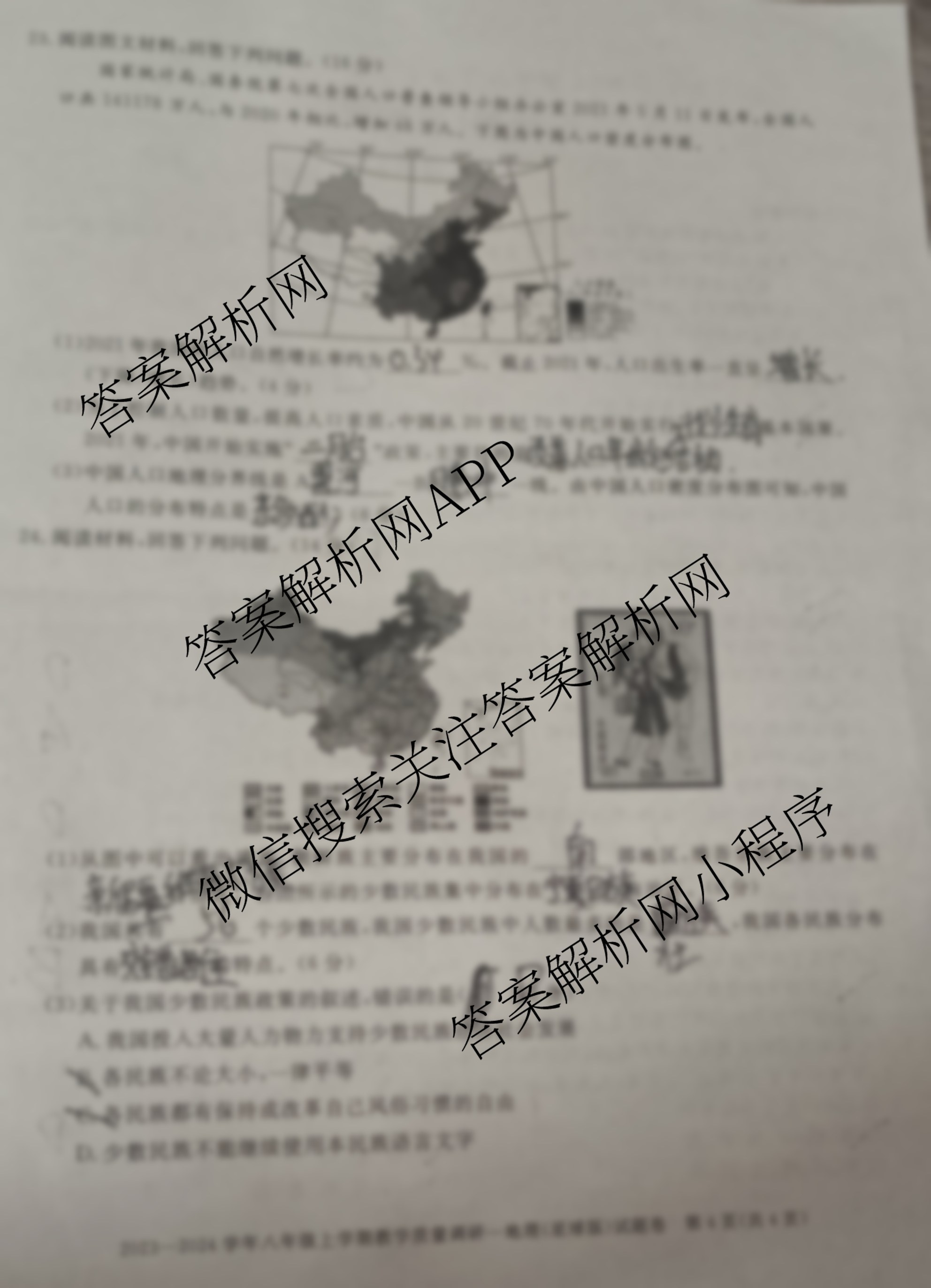 - [八年级]安徽省2023~2024学年上学期教学质量调研一地理(星球版)答案