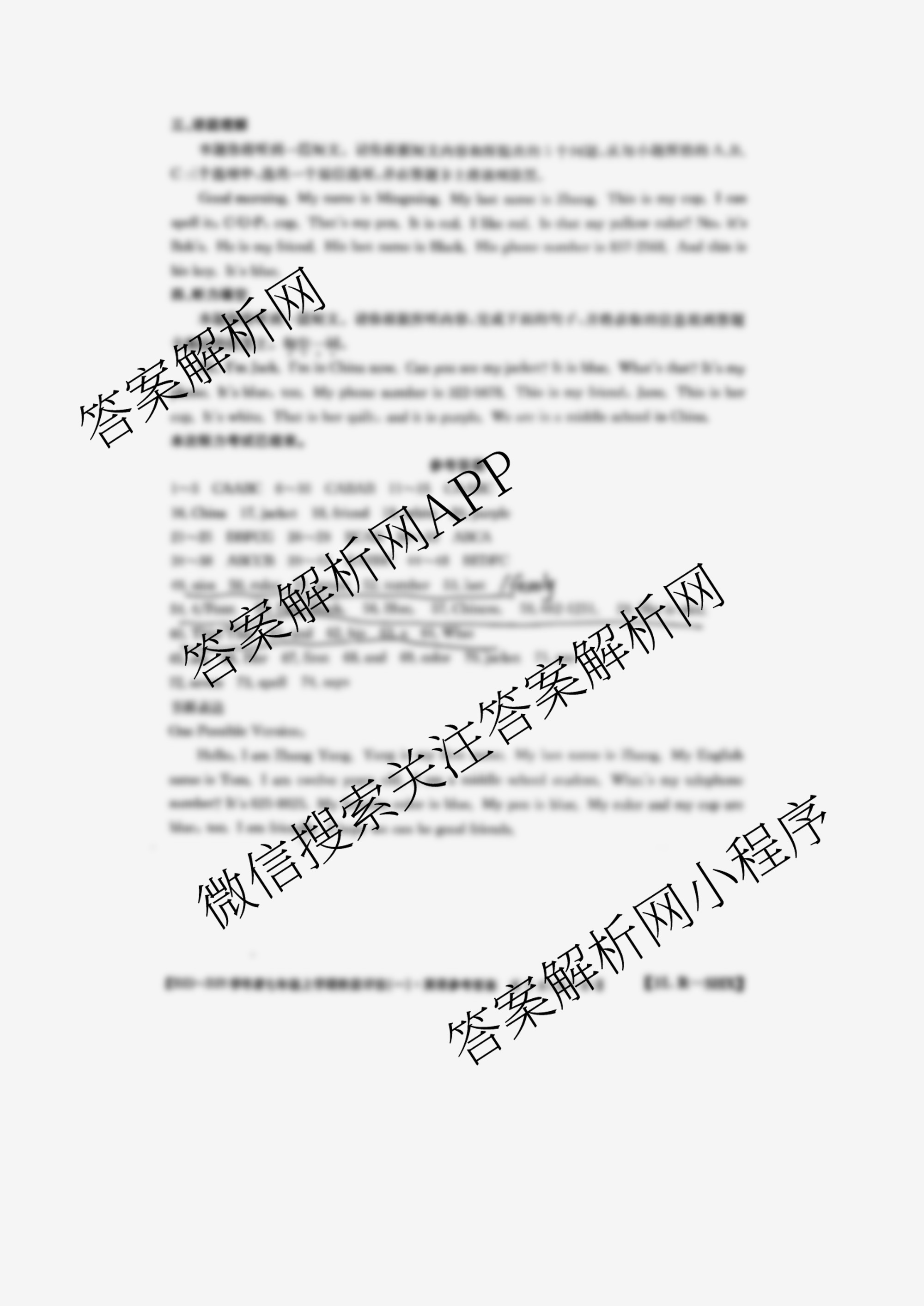 - 2023~2024山西省学年度[七年级]上学期阶段评估(一)[1L R-SHX]英语(R)答案
