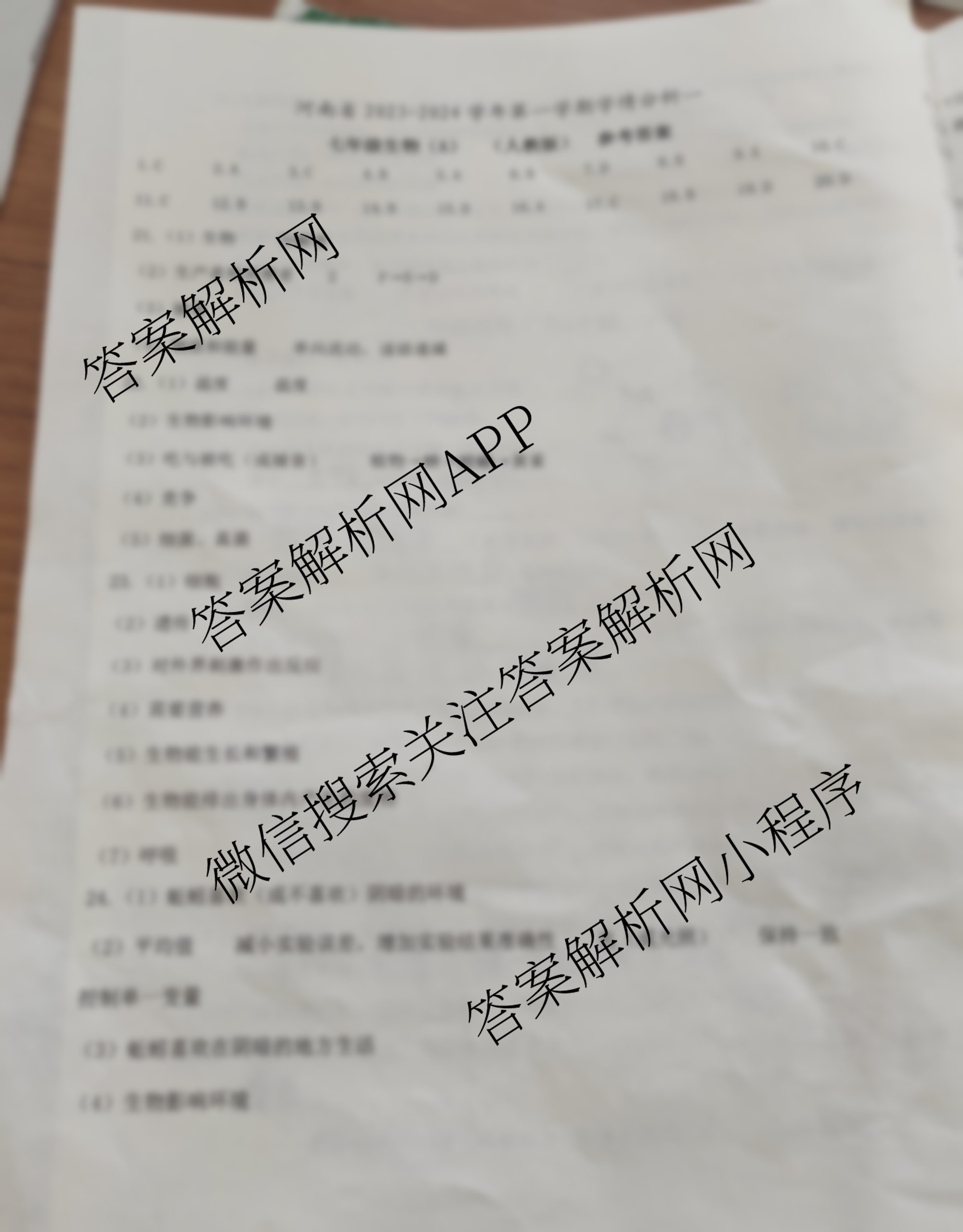 2023~2024(七年级)河南省学年第一学期学情分析一生物(A人教版)答案