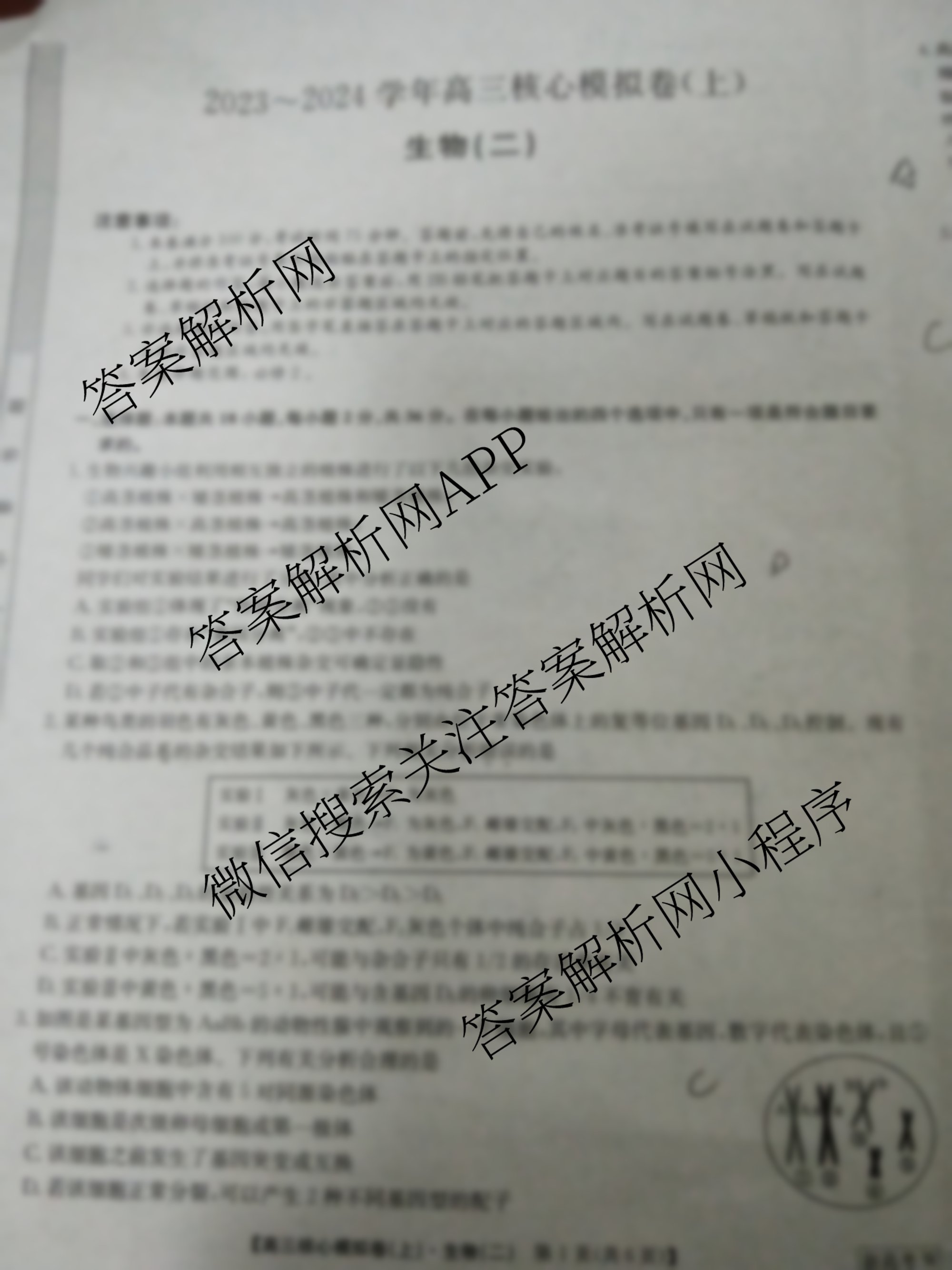 - [高三][九师联盟]·2023~2024学年核心模拟卷(上)(二)2生物(新教材)答案