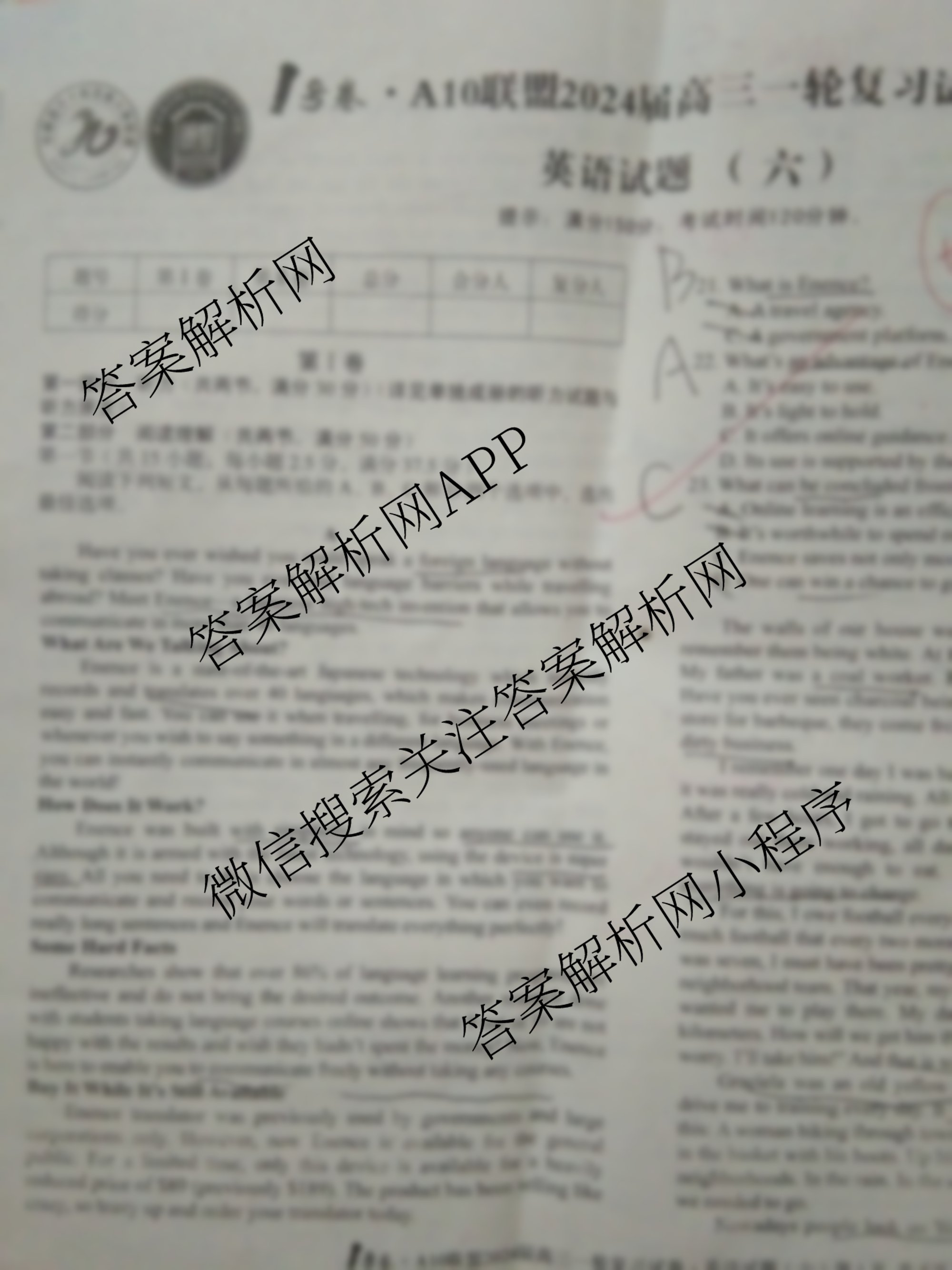 1号卷A10联盟2024届高三一轮复习试卷 英语(六)6试题