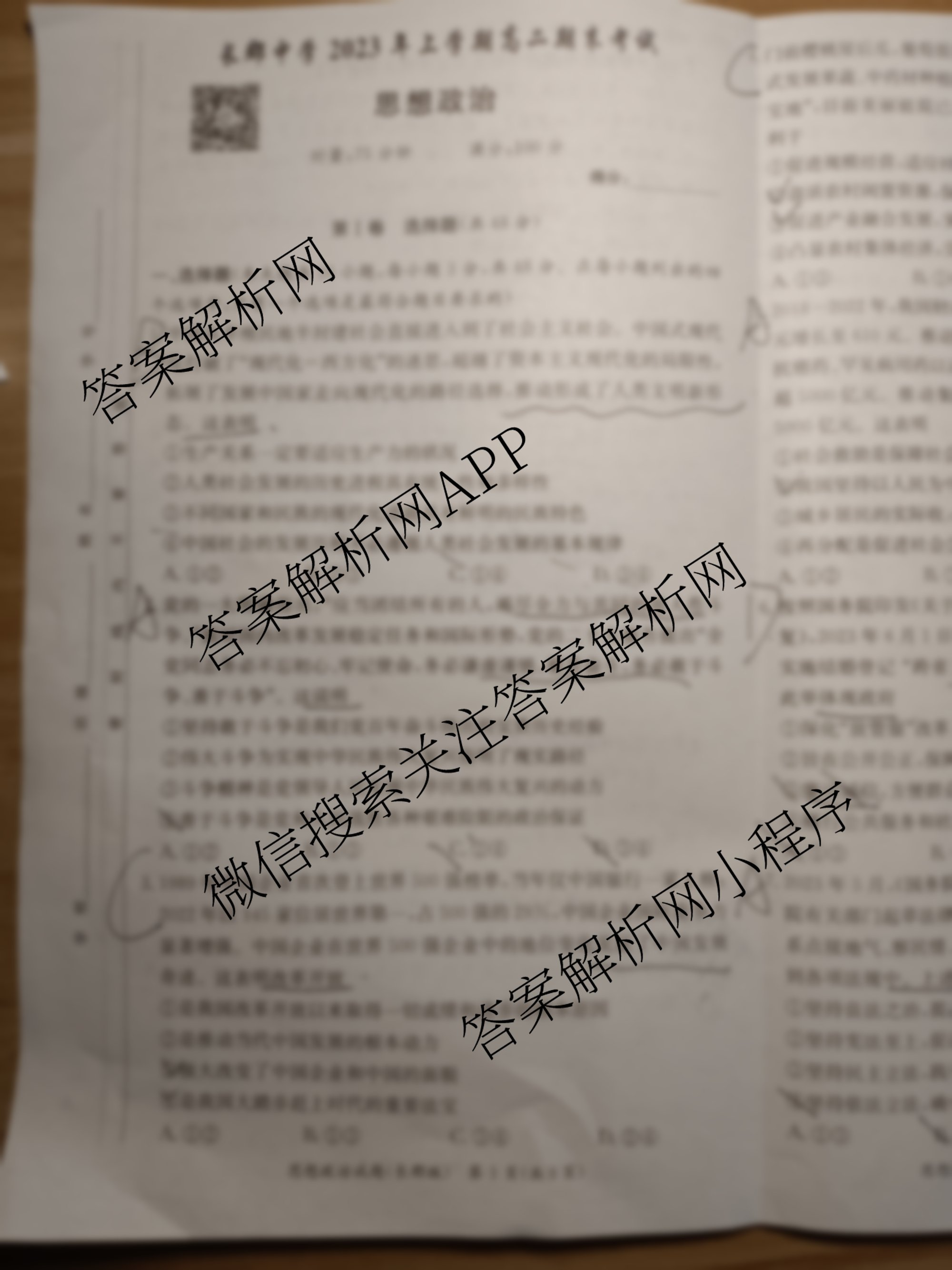 - [高二](炎德英才大联考)长郡中学2023年上学期期末考试政治答案
