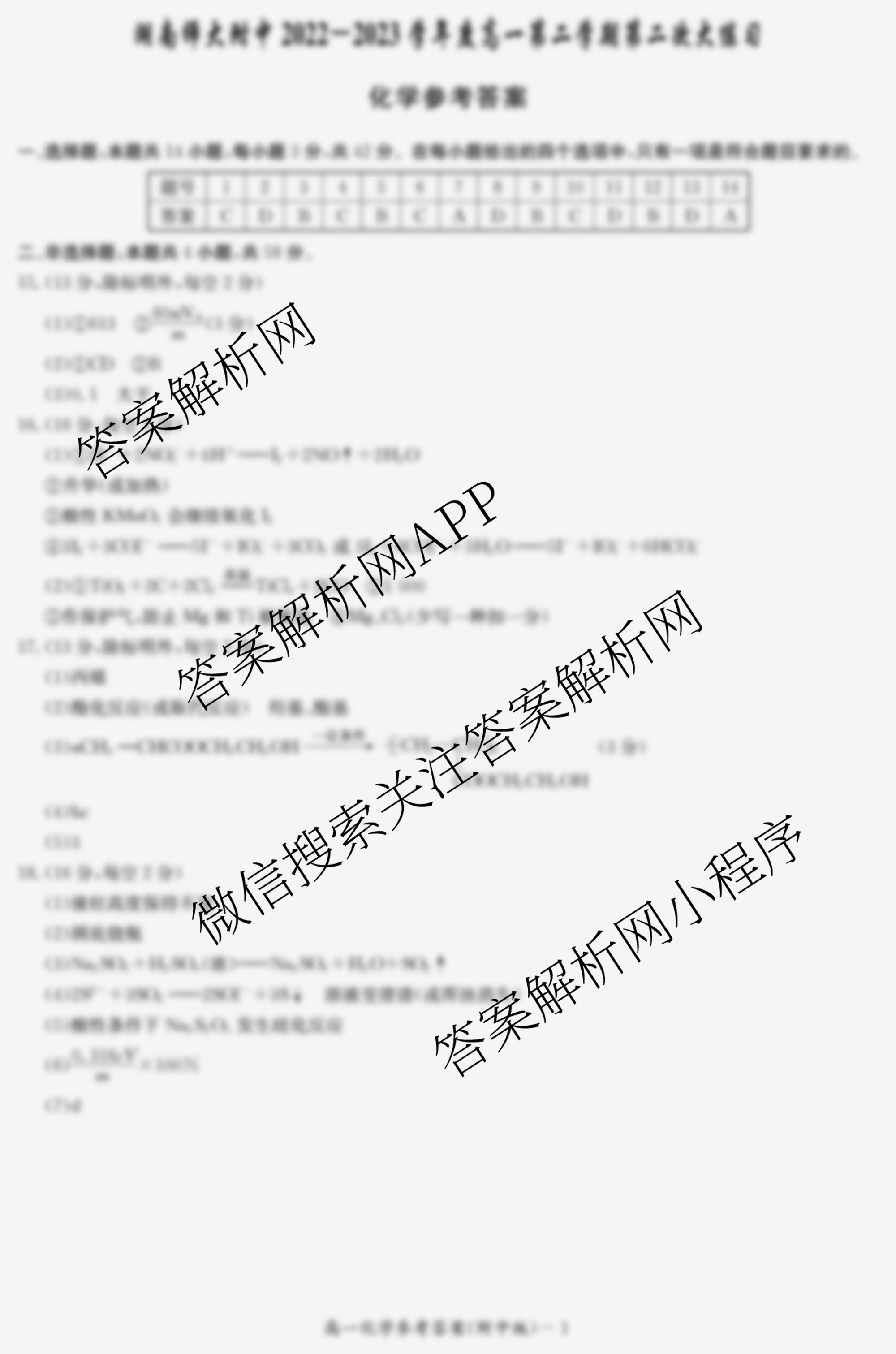 - 2022-2023[高一]湖南师大附中学年度第二学期第二次大练习化学答案