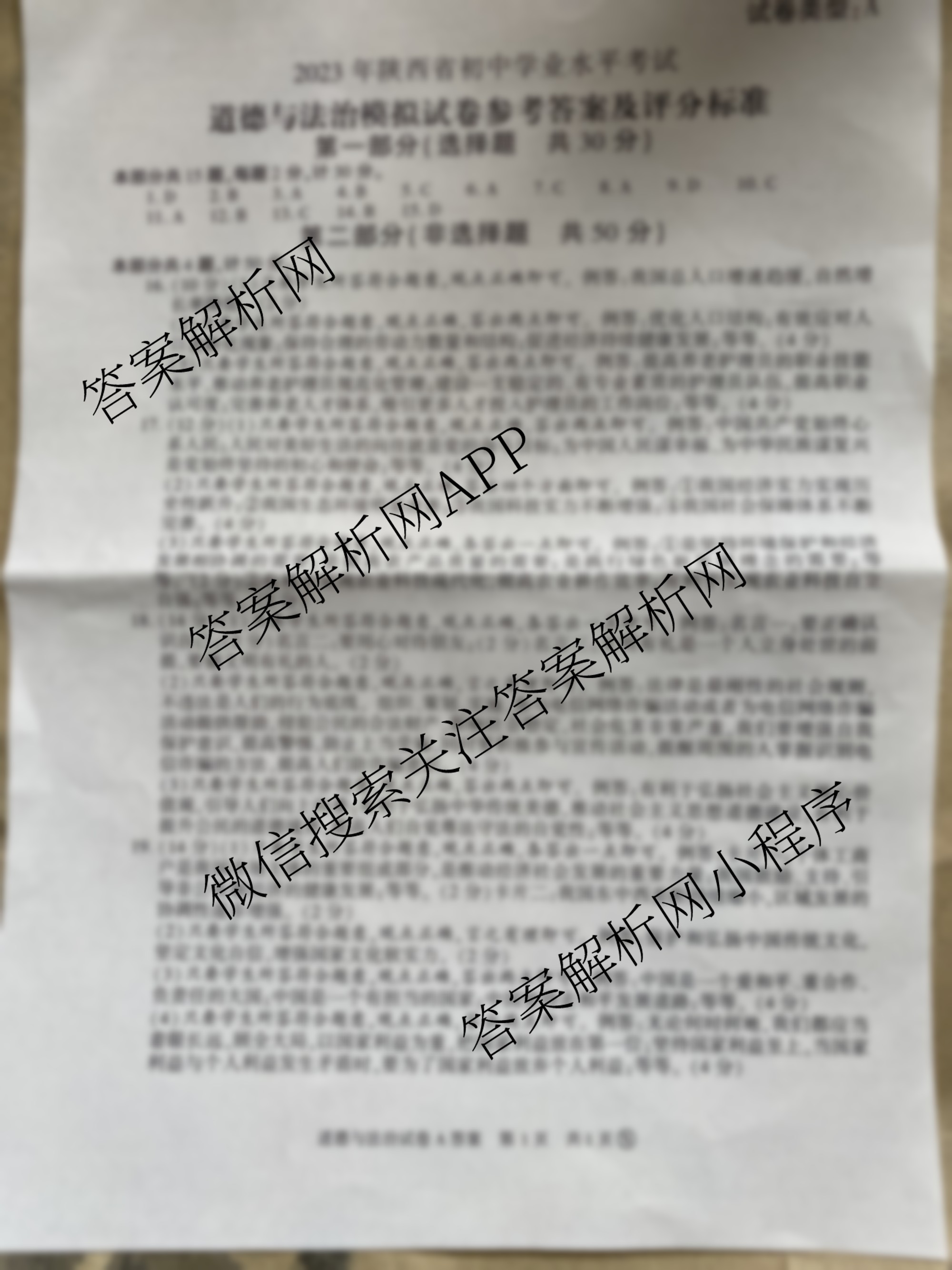 - [益卷]2023年陕西省初中学业水平考试道德与法治模拟试卷(A)答案