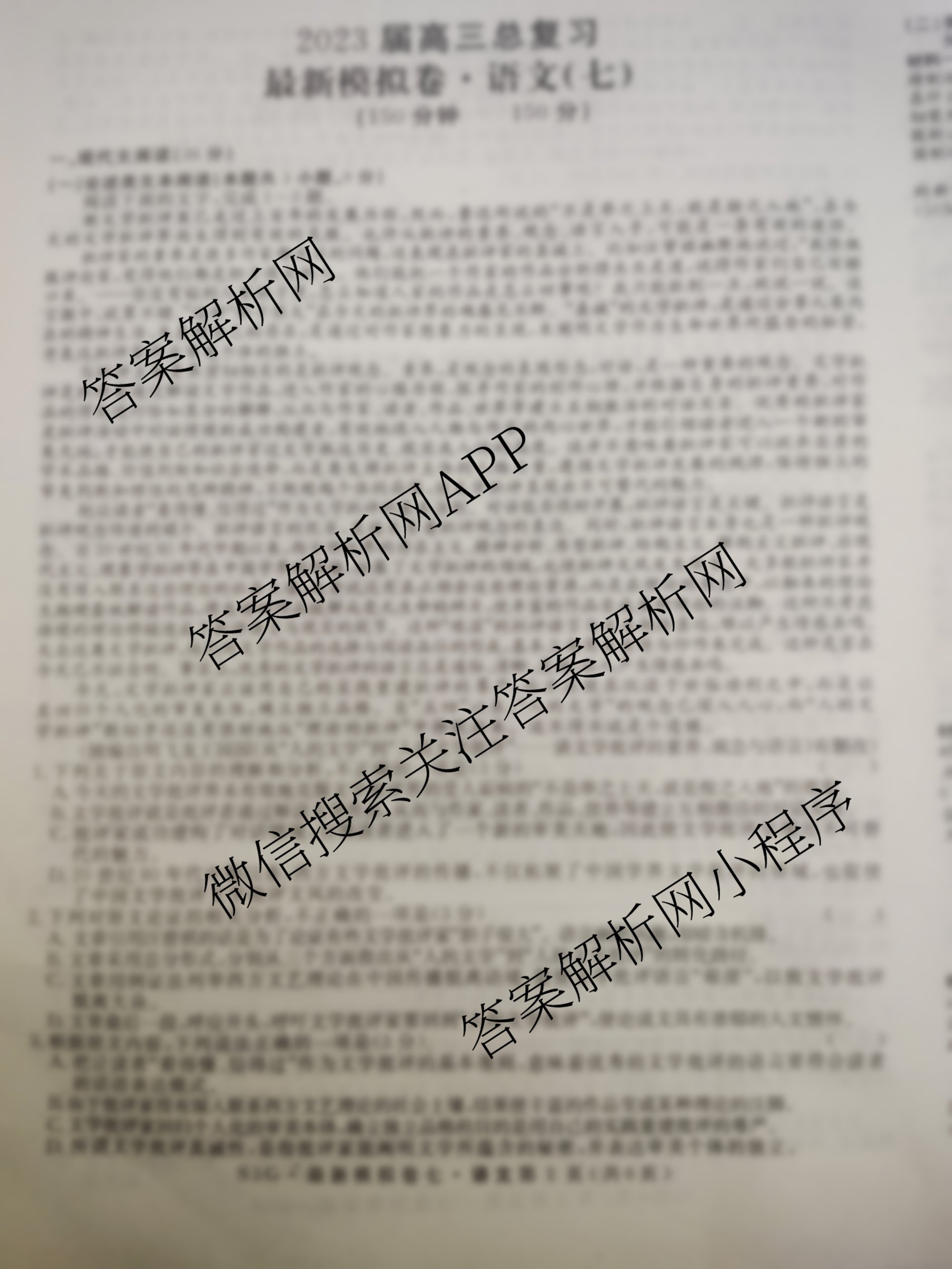 - 2023年普通高等学校招生全国统一考试 最新模拟卷 语文(新S3G)(七)7答案