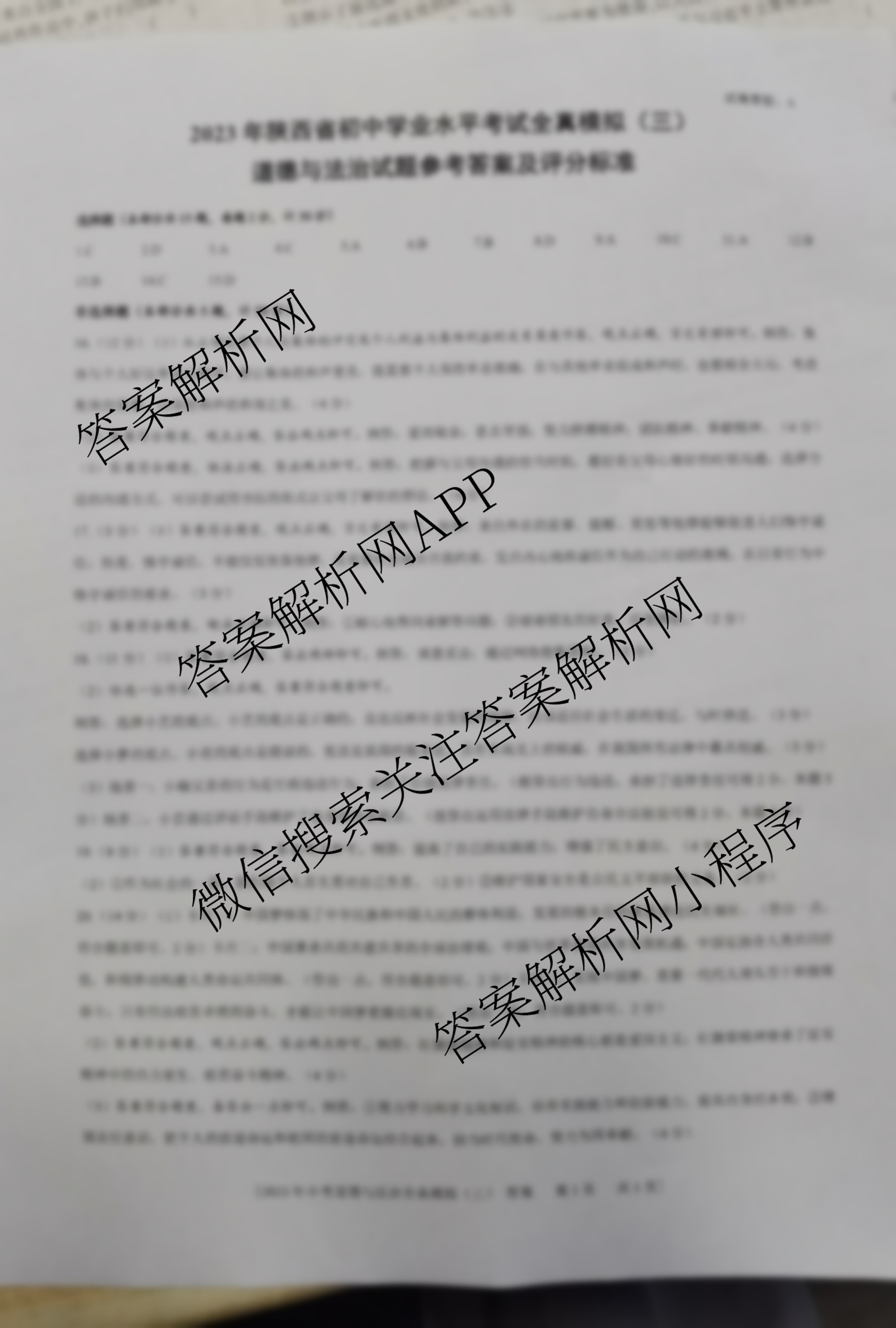 - [九年级]2023年陕西省初中学业水平考试全真模拟卷(三)道德与法治(A)答案
