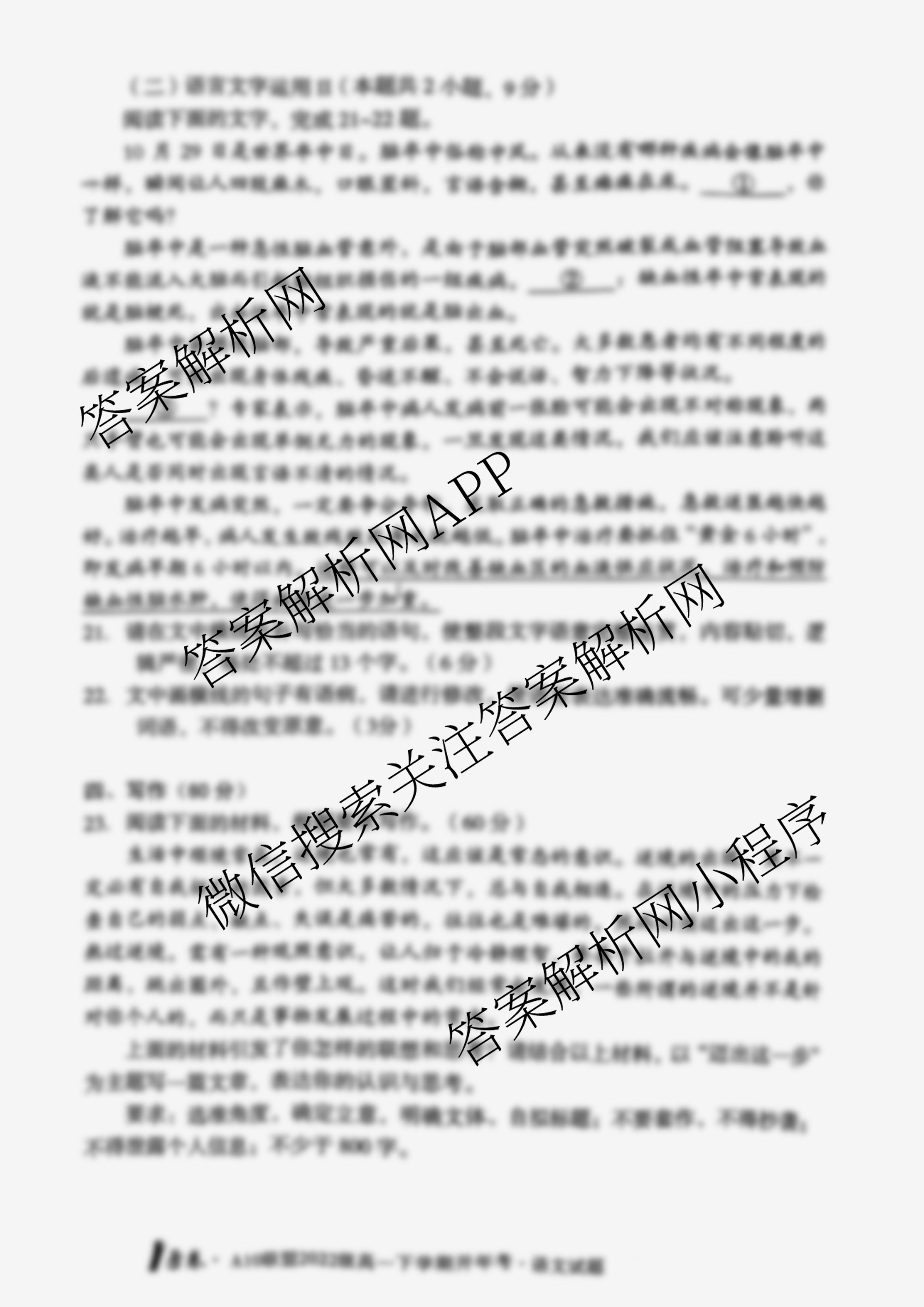 - (高一)[1号卷]·A10联盟2022级下学期开年考语文答案