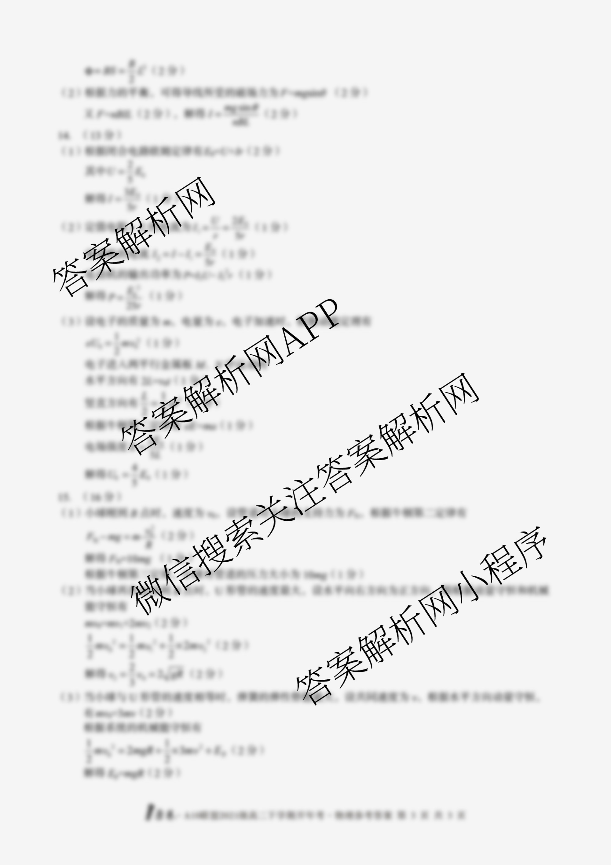 - (高二)[1号卷]A10联盟2021级下学期开年考物理答案