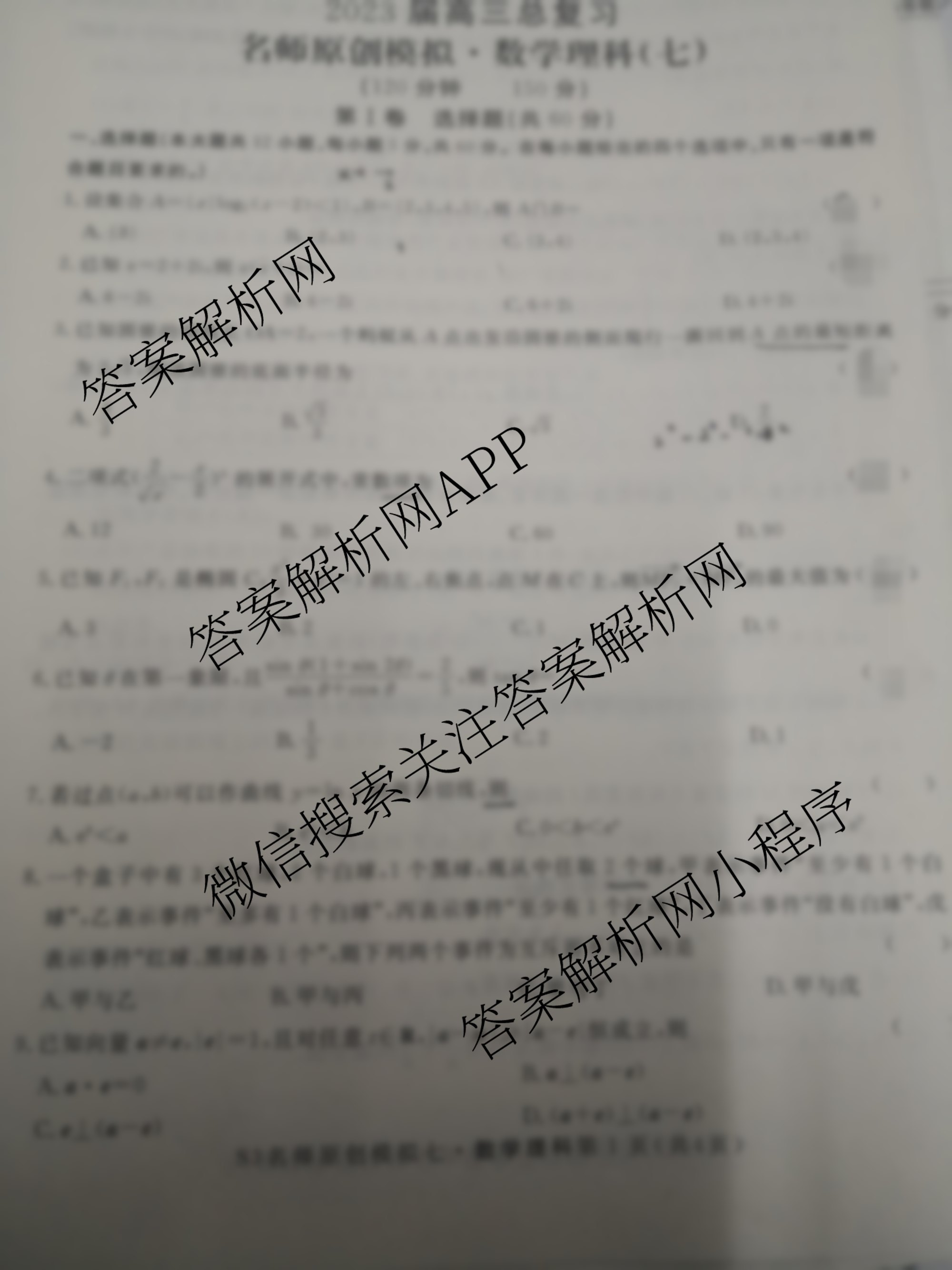 2023届高三总复习S3名师原创模拟理数(七)7试题