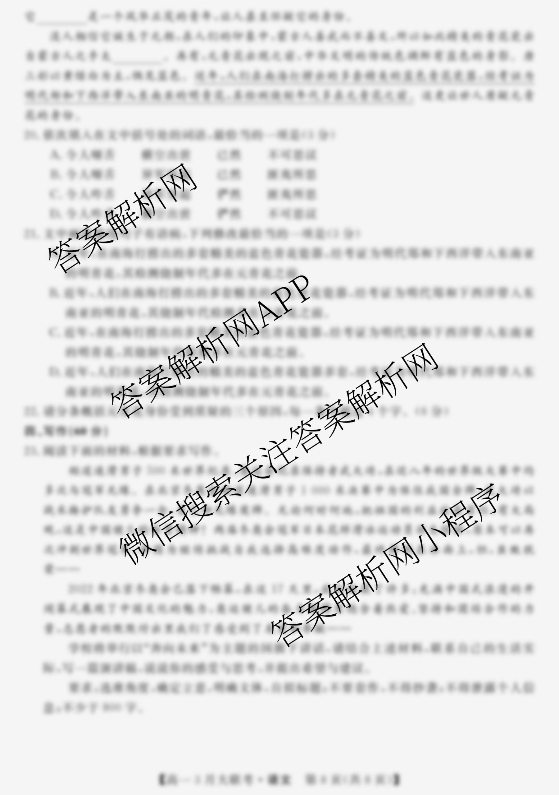 - [天壹名校联盟]2022年上学期(高一)3月大联考语文试题