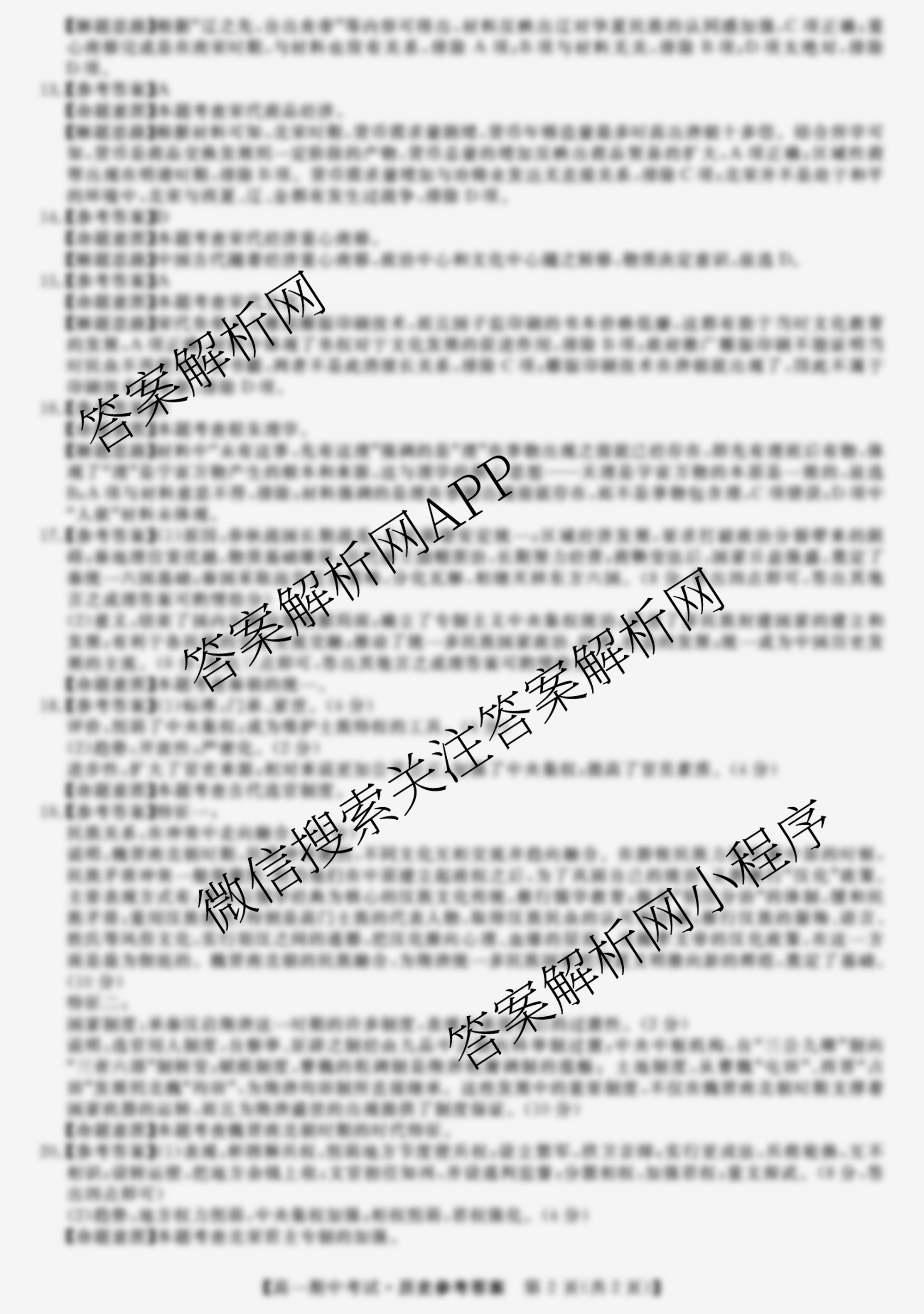 - [高一](天壹名校联盟)2021年下学期期中考试历史答案