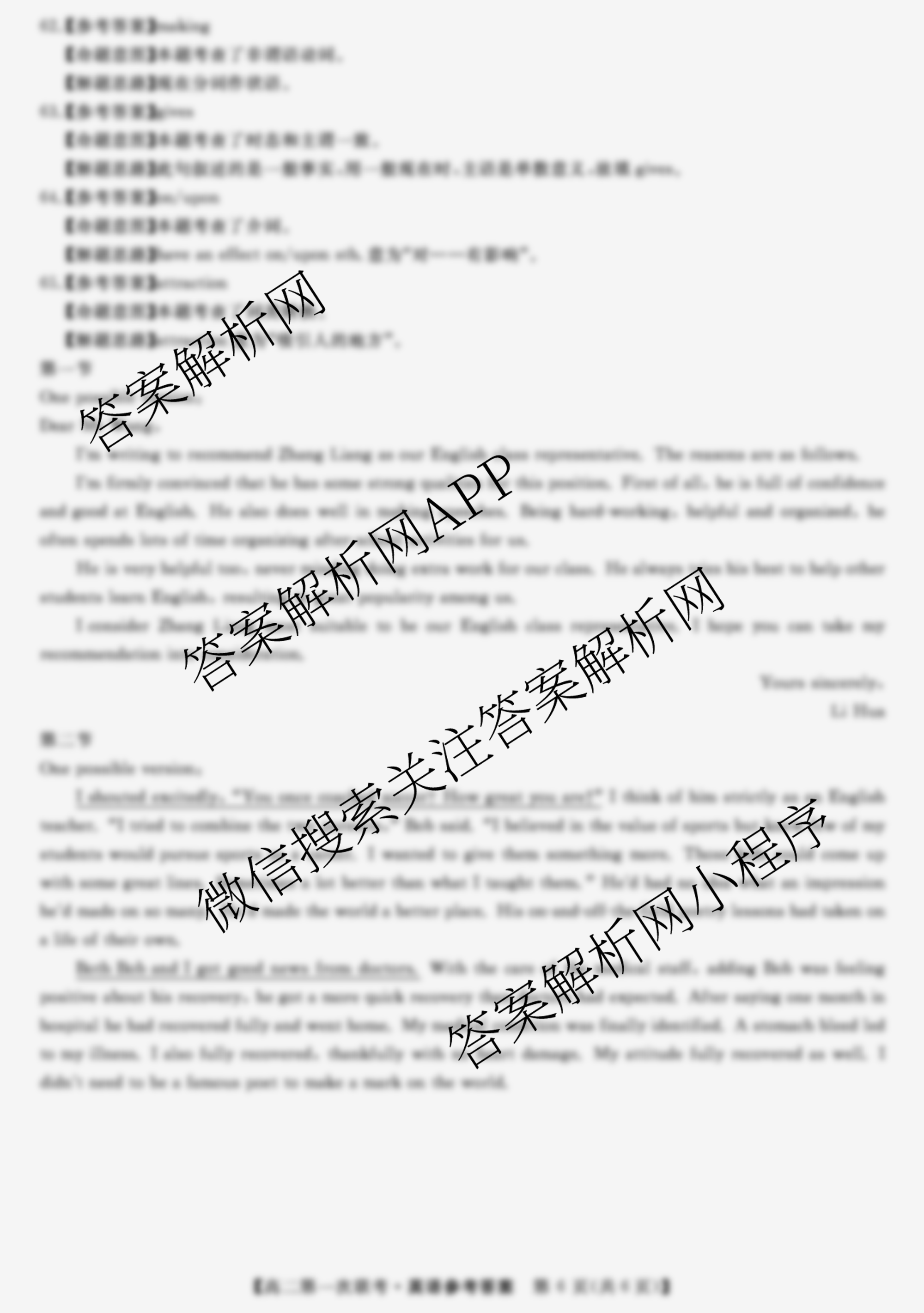 - 高二(天壹名校联盟)2021年下学期第一次联考英语答案