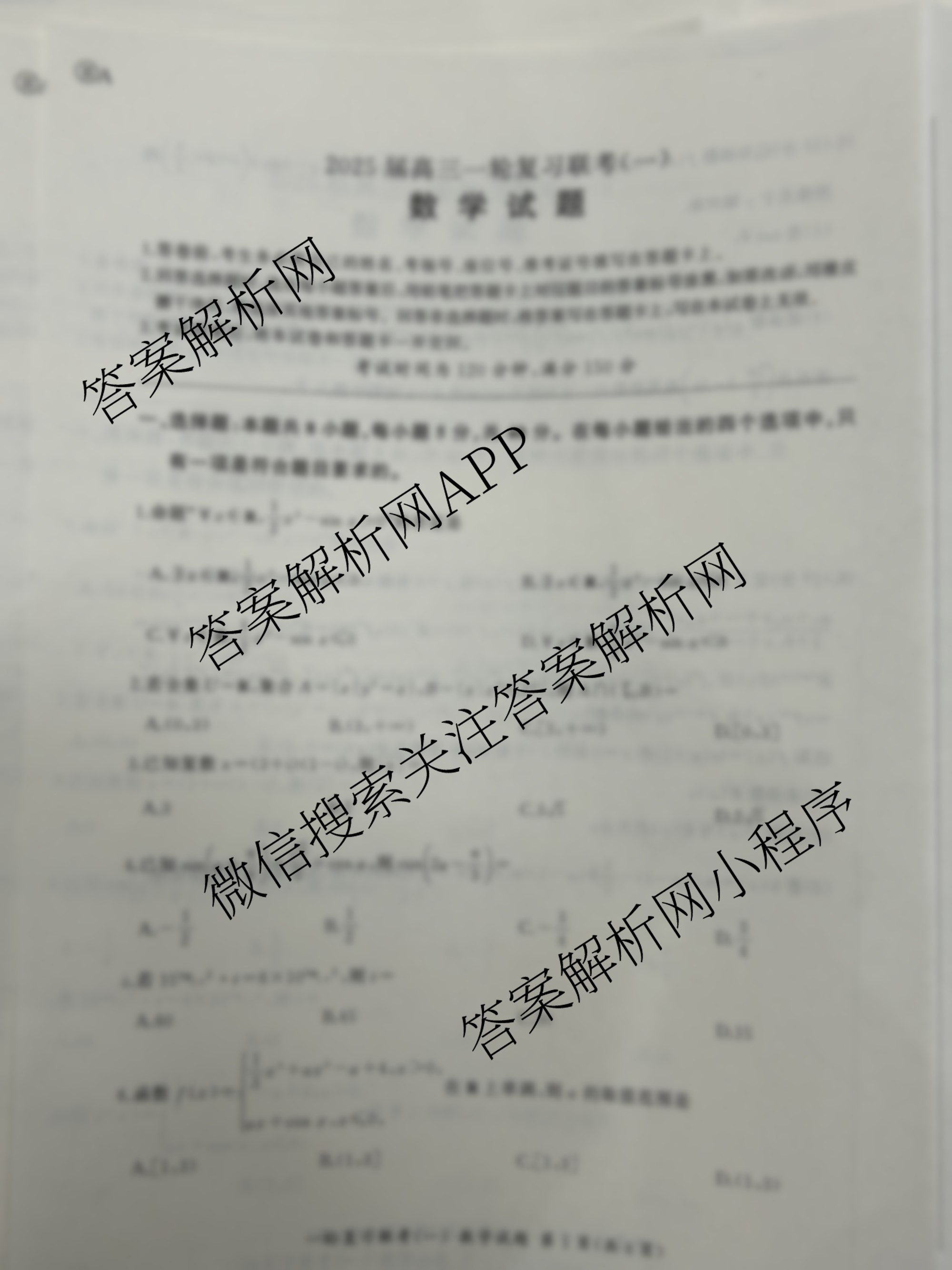 - [高三](百师联盟)·2025届一轮复习联考(一)数学(百A)试题