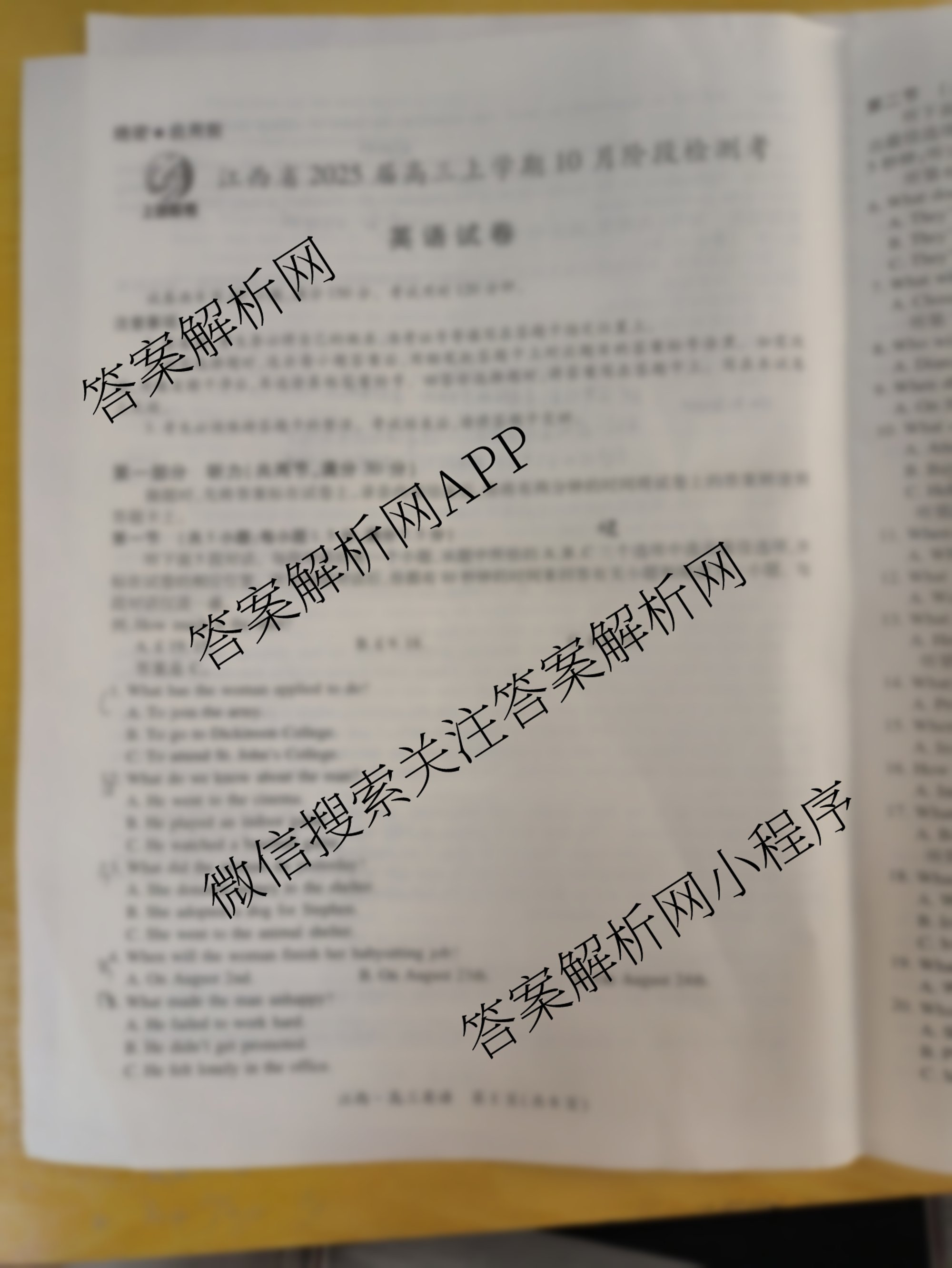- [高三]上进联考·江西省2025届上学期10月阶段检测考英语答案