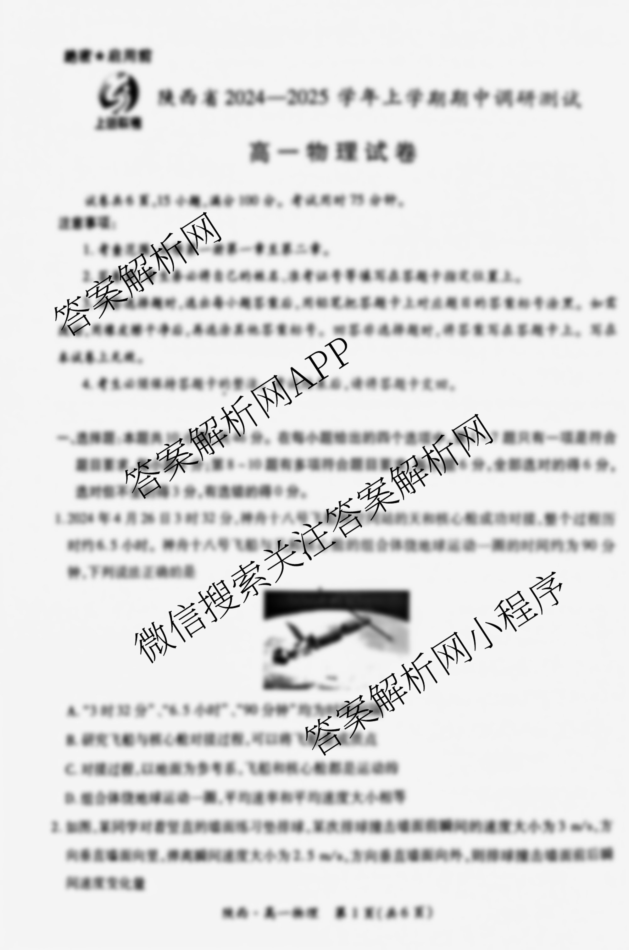 - [高一]上进联考·2024年年级上学期期中调研测试物理(陕西)试题