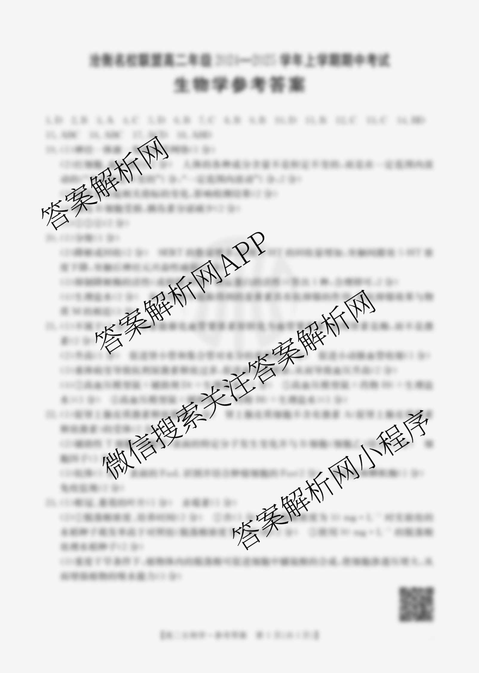 - (高二)河北省沧衡名校联盟年级2024~2025学年上学期期中考试生物答案