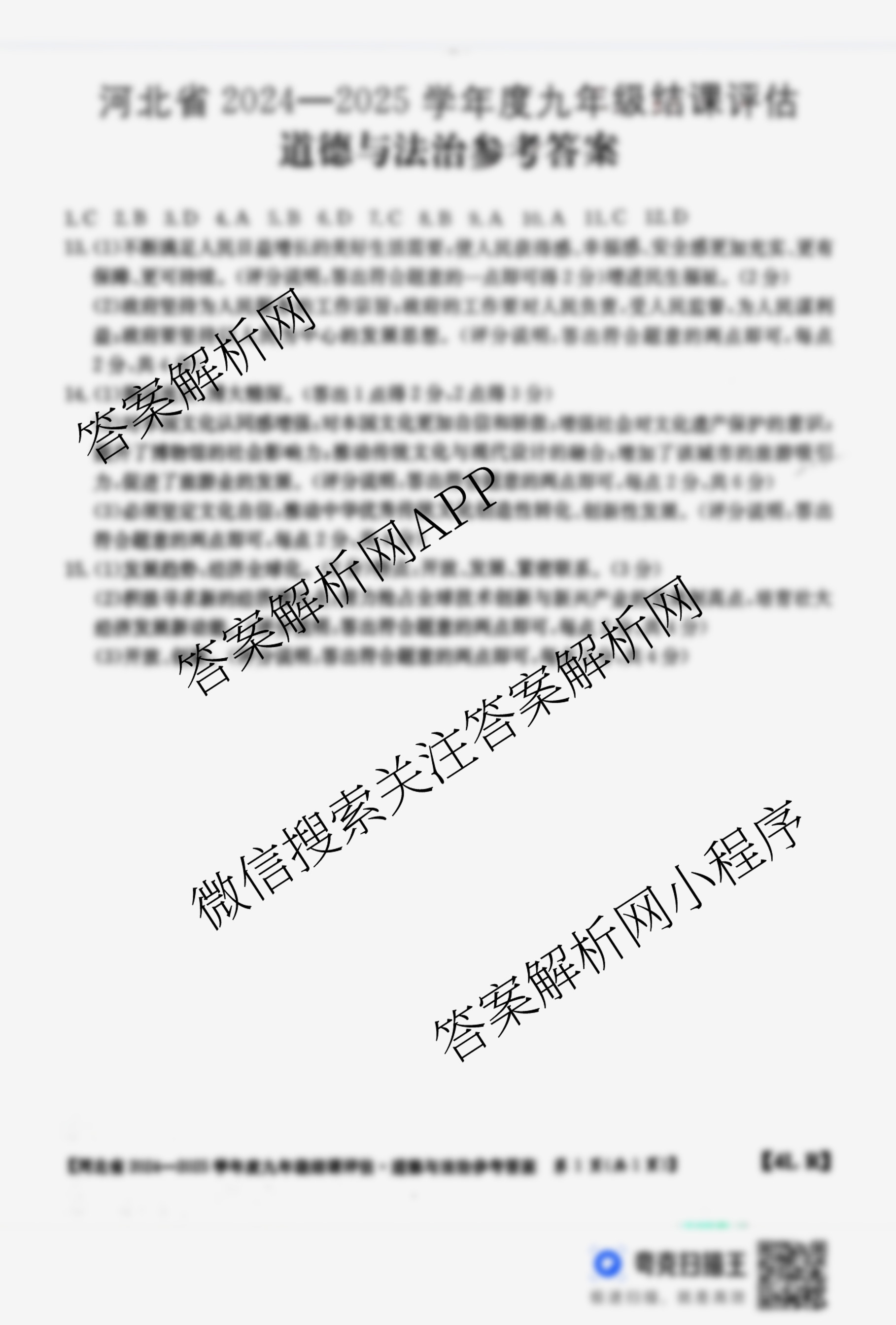 - [九年级]河北省2024-2025学年度结课评估[4L]道德与法治(R)答案
