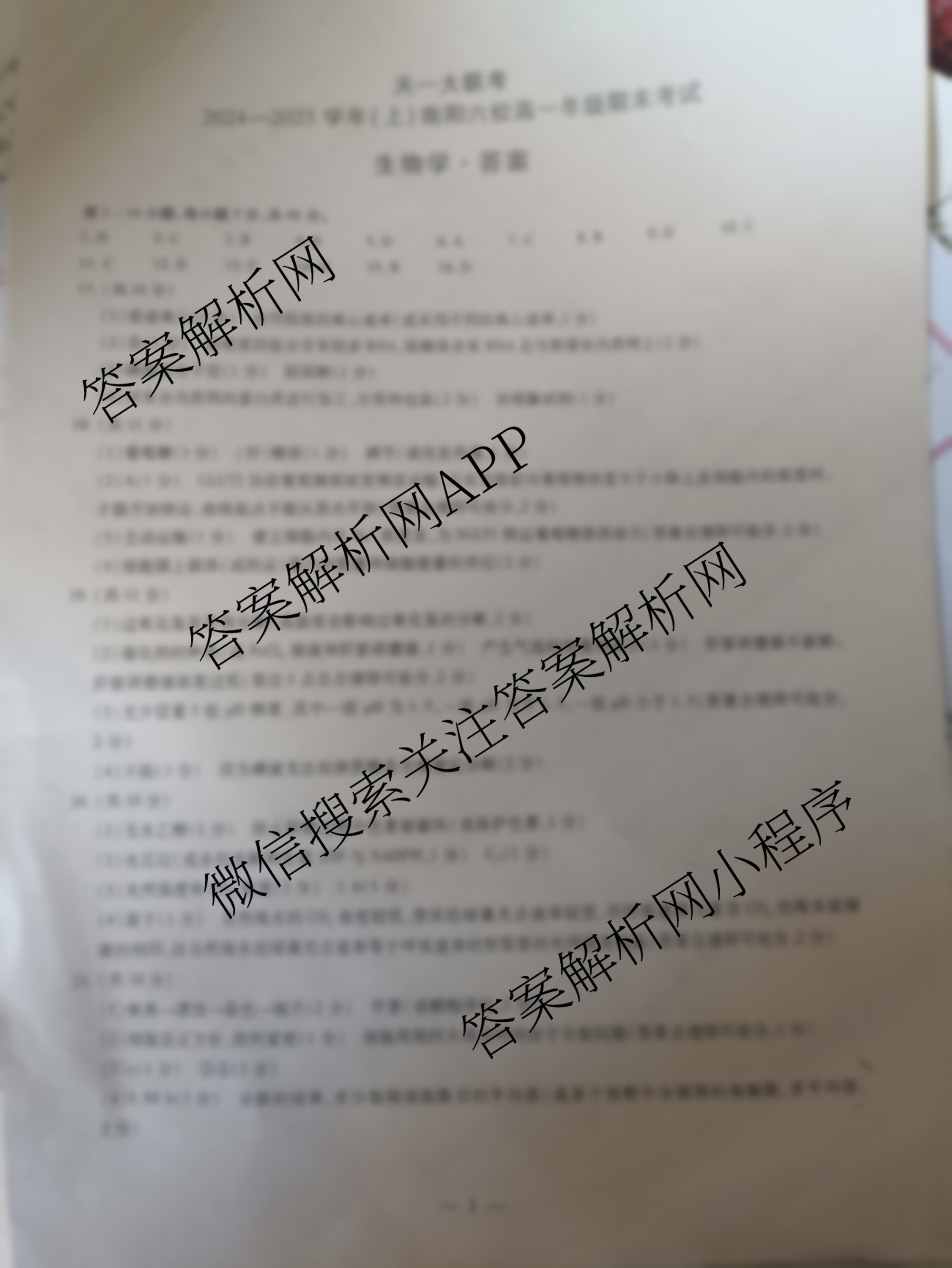 2024~2025[高一](天一大联考)·学年(上)南阳六校年级期末考试生物答案