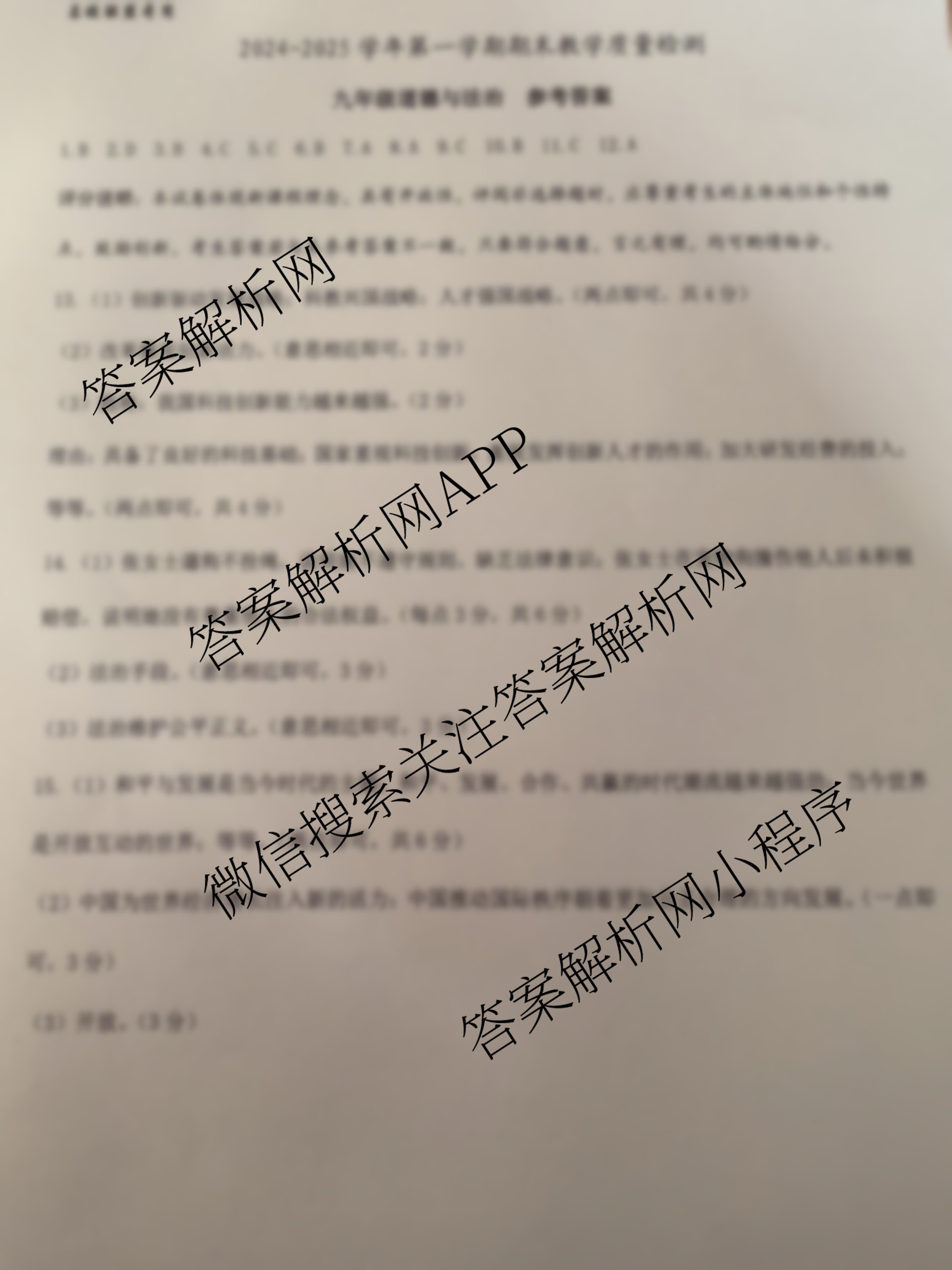 - 2024~2025(九年级)名校联盟专用·河北省学年第一学期期末教学质量检测道德与法治答案