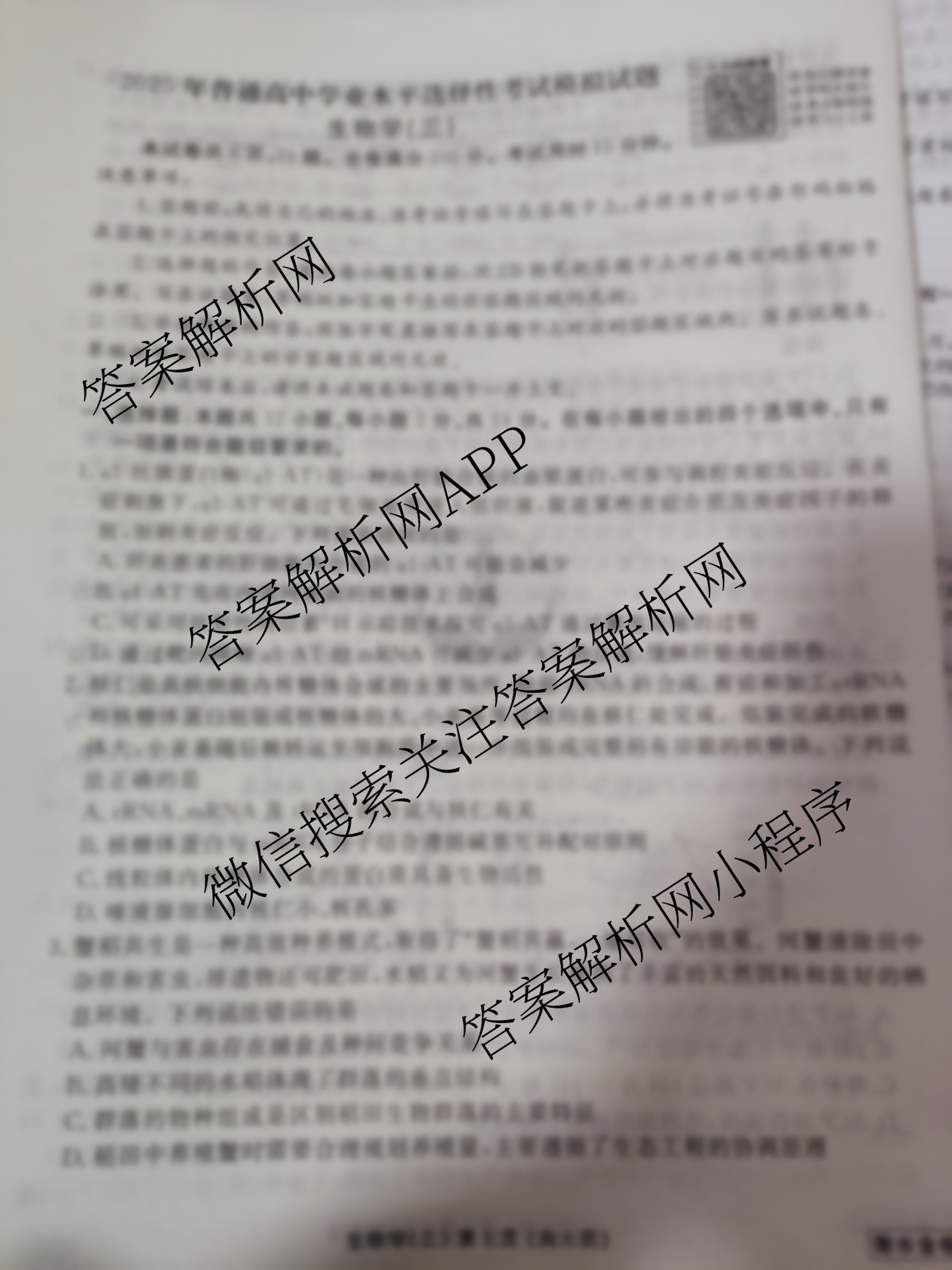 - [高三]衡水金卷先享题调研卷 2025年普通高中学业水平选择性考试模拟试题 生物(S)(三)3答案