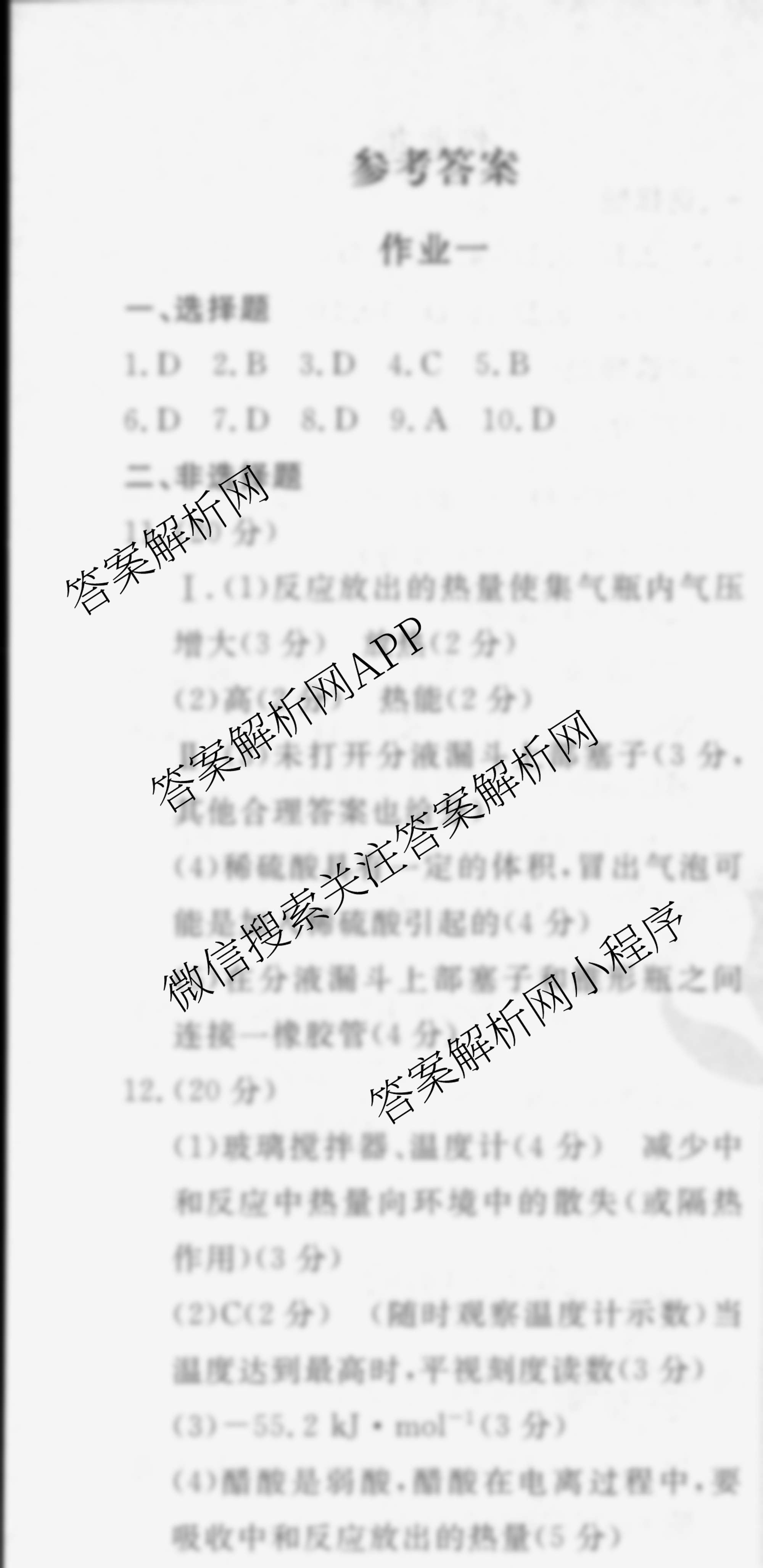 衡水金卷先享题2024-2025学年度高二寒假作业 化学 作业一答案